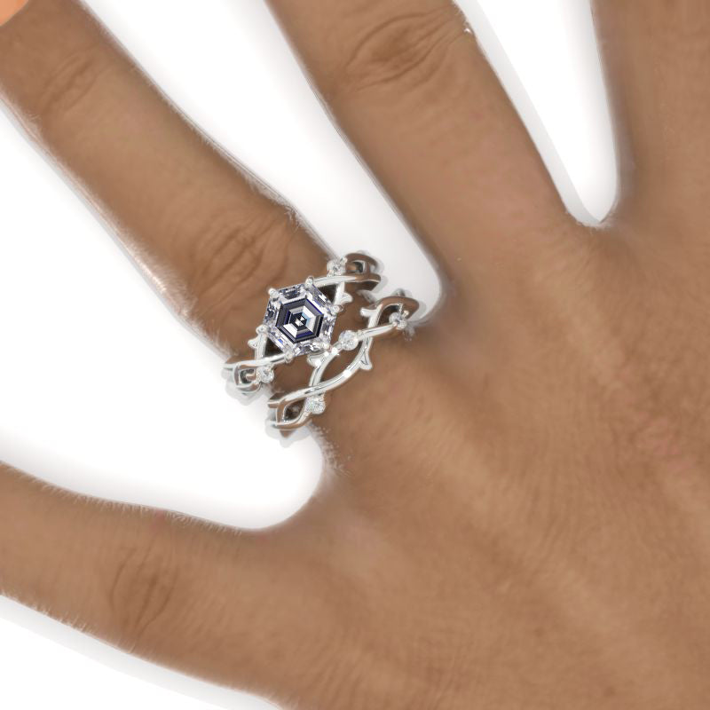 Engagement Ring: 3 Carat Giliarto Gray Moissanite Hexagon 8mm Gray-Color, VVS1-Clarity, VG-Cut, Ex-Polish, VG-Symmetry Center Stone set with D- Colorless Moissanite Accent Stones in 14K White Gold Ring.
