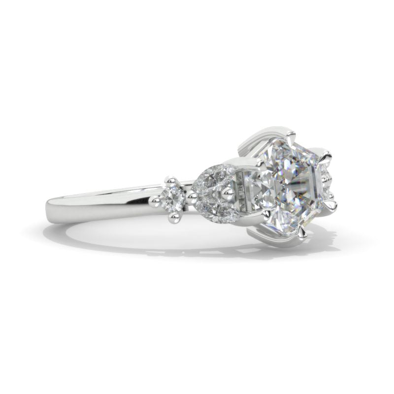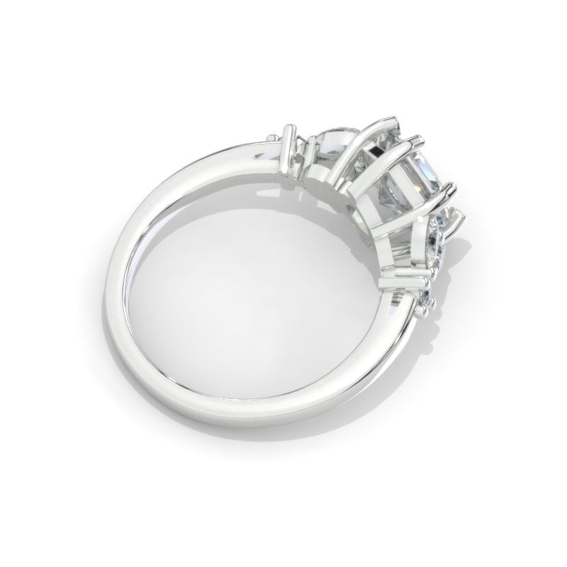 Engagement: Approximately 3+ Carat LAB-Grown Diamond Elongated Hexagon 8mm D-Colorless, VVS1-Clarity, VG-Cut, Ex-Polish, VG-Symmetry Center Stone with Colorless 0.3 CTW LAB-Grown Diamond Accent Stones 14K White Gold Ring.