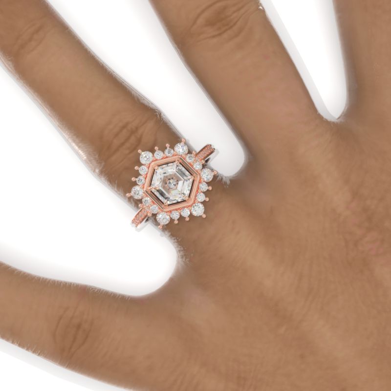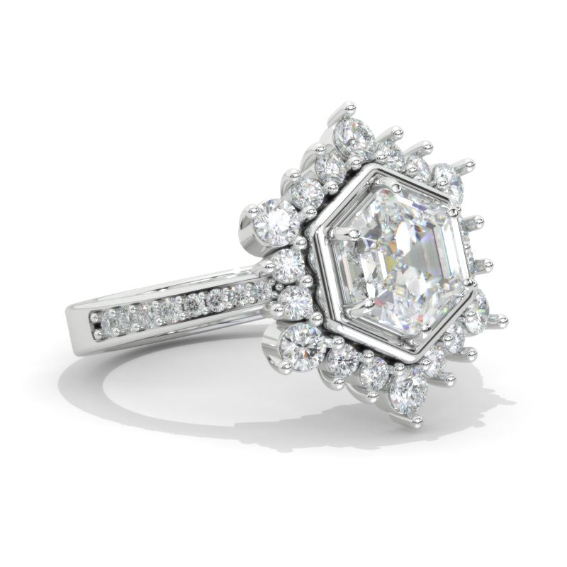 Engagement: Approximately 3+ Carat LAB-Grown Diamond Hexagon 8mm D-Colorless, VVS1-Clarity, VG-Cut, Ex-Polish, VG-Symmetry Center Stone with Colorless 0.5 CTW LAB-Grown Diamond Accent Stones 14K White Gold Ring.