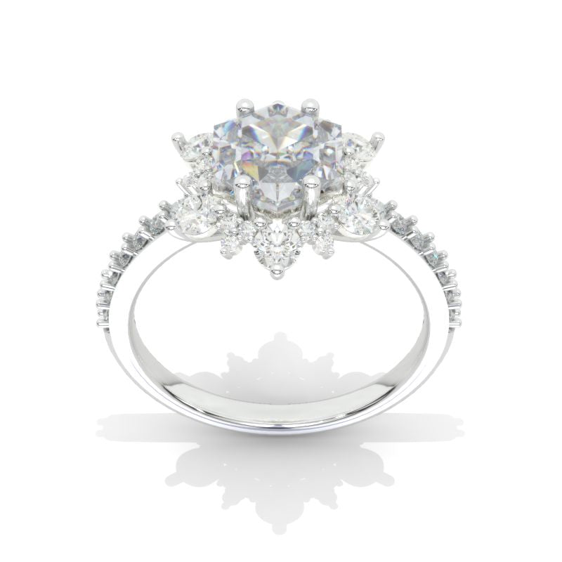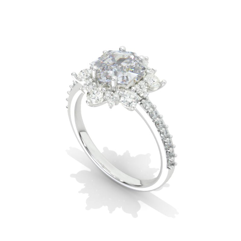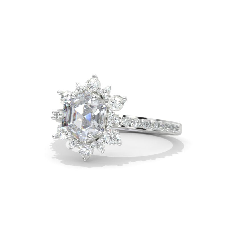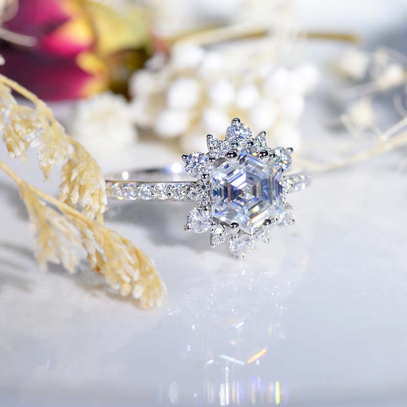 The default design option features 8mm Hexagon Cut LAB-Grown Diamond Stone, D-Colorless, VVS1-Clarity, VG-Cut, Ex-Polish, VG-Symmetry with 0.6 C.T.W. Accent Stones