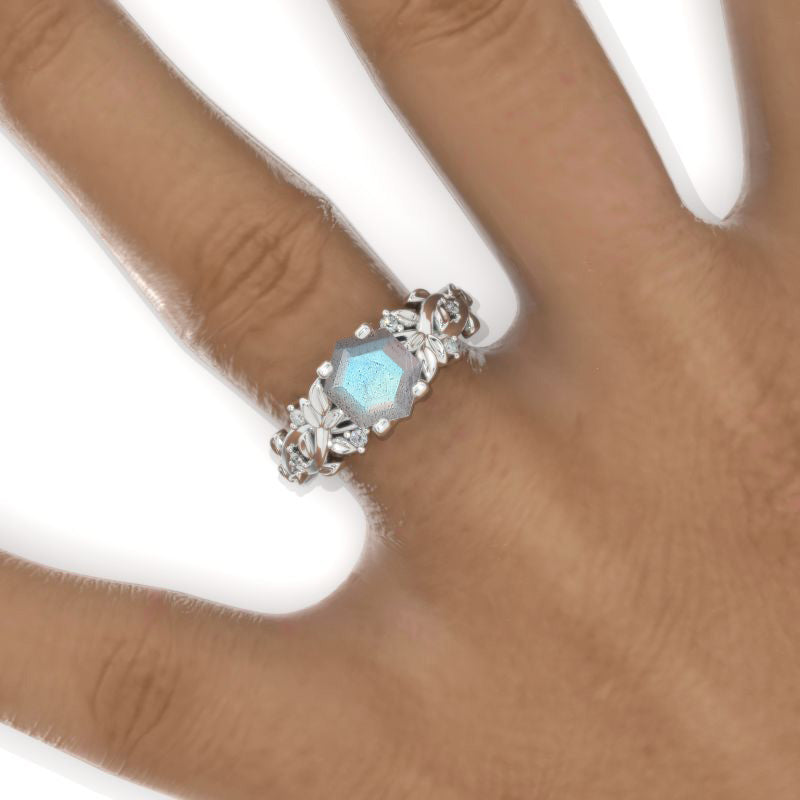 3 Carat Hexagon Labradorite Floral 14K White Gold Engagement Ring - Giliarto