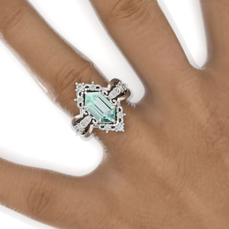 Engagement Ring: 3 Carat Ethically Lab-Grown Mint Sapphire Hexagon 12x6mm Mint-Color VG-Cut, Ex-Polish, VG-Symmetry Center Stone set with D- Colorless Moissanite Accent Stones in 14K White Gold Ring.