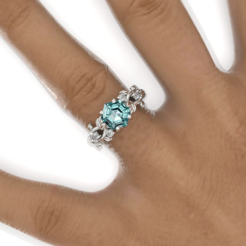 3 Carat Hexagon Mint Sapphire Floral 14K White Gold Engagement Ring - Giliarto