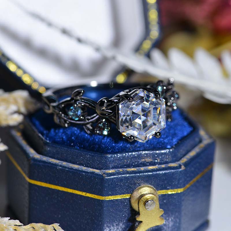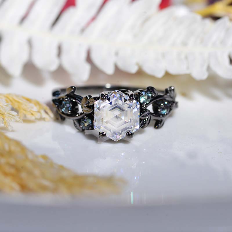 3 Carat Hexagon Moissanite Alexandrite Floral 14K Black Gold Engagement Ring