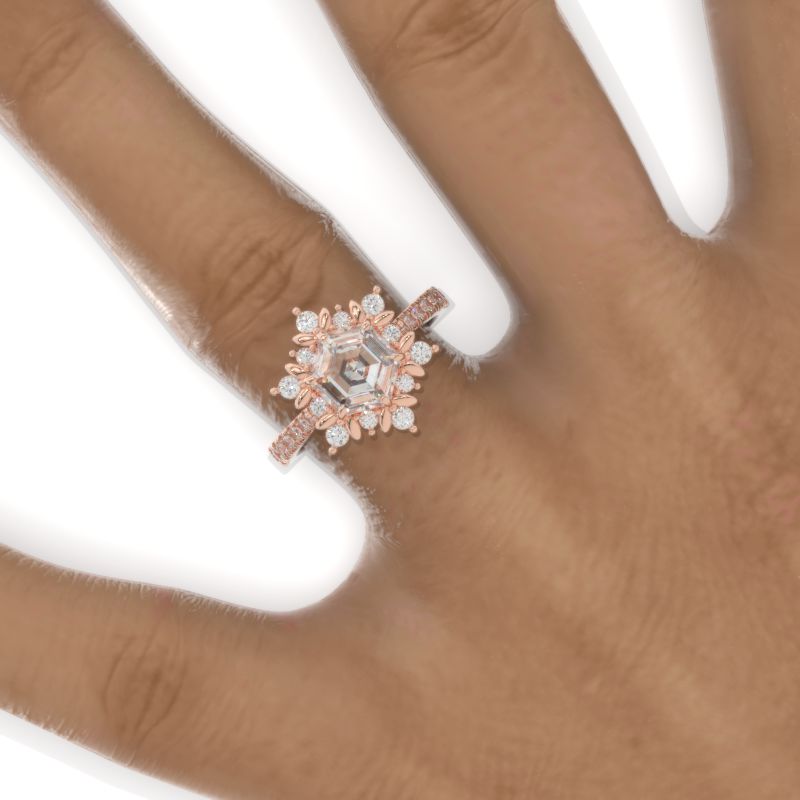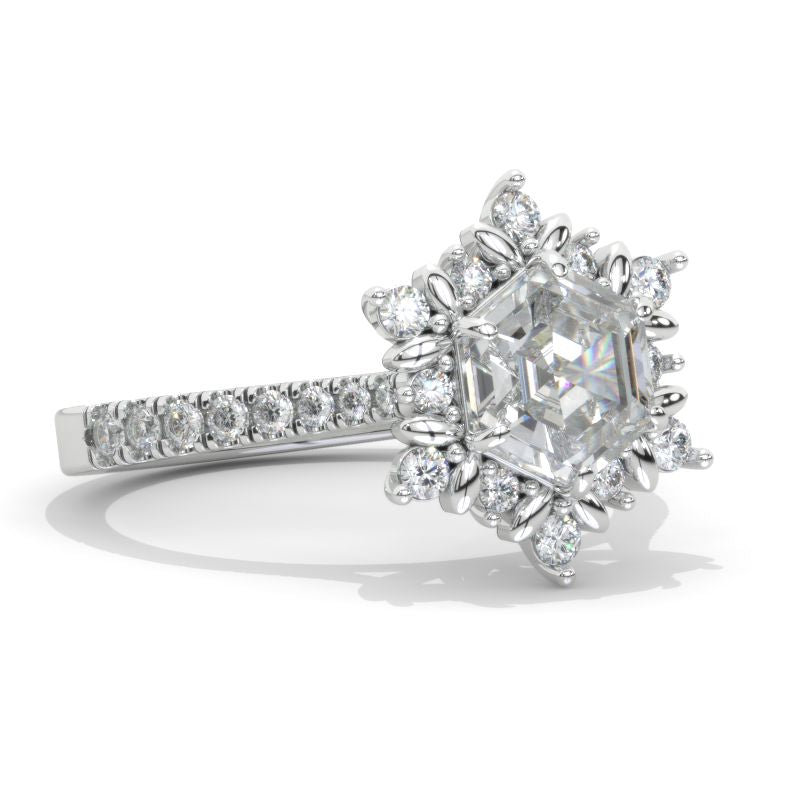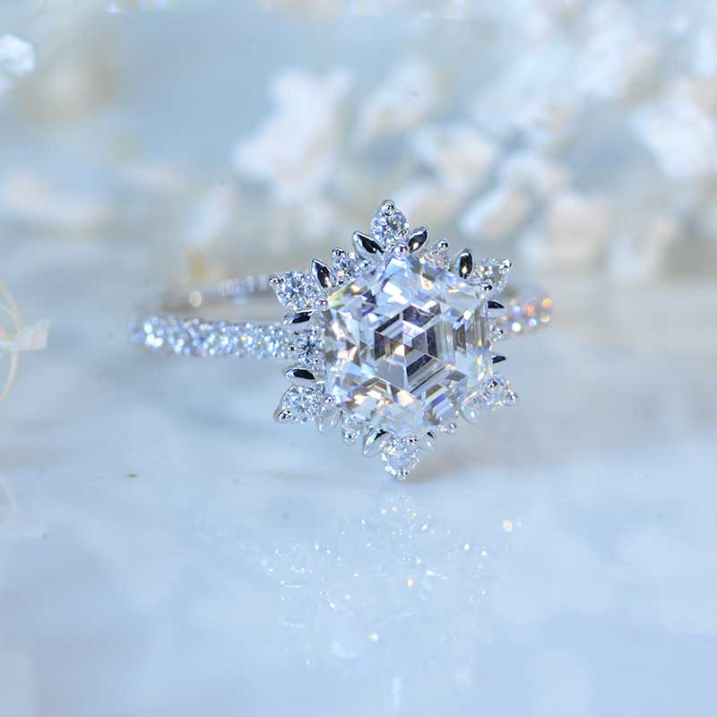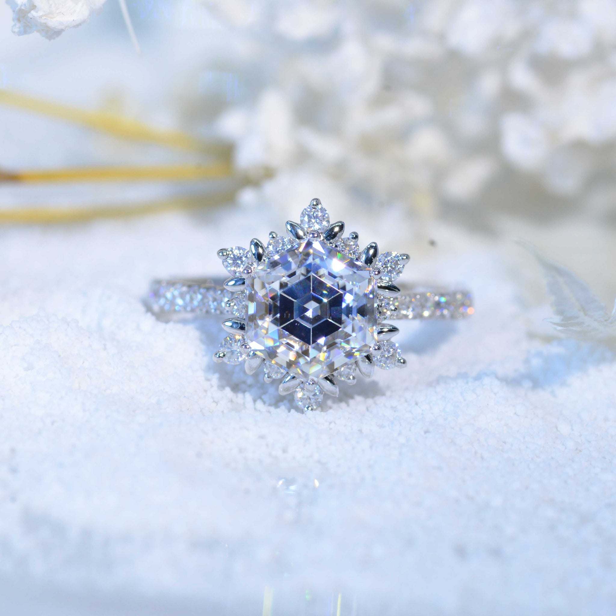 Engagement: 3 Carat Giliarto Moissanite Hexagon 8mm D-Colorless, VVS1-Clarity, VG-Cut, Ex-Polish, VG-Symmetry Center Stone with Colorless 0.5 CTW Moissanite Accent Stones 14K White Gold Ring.