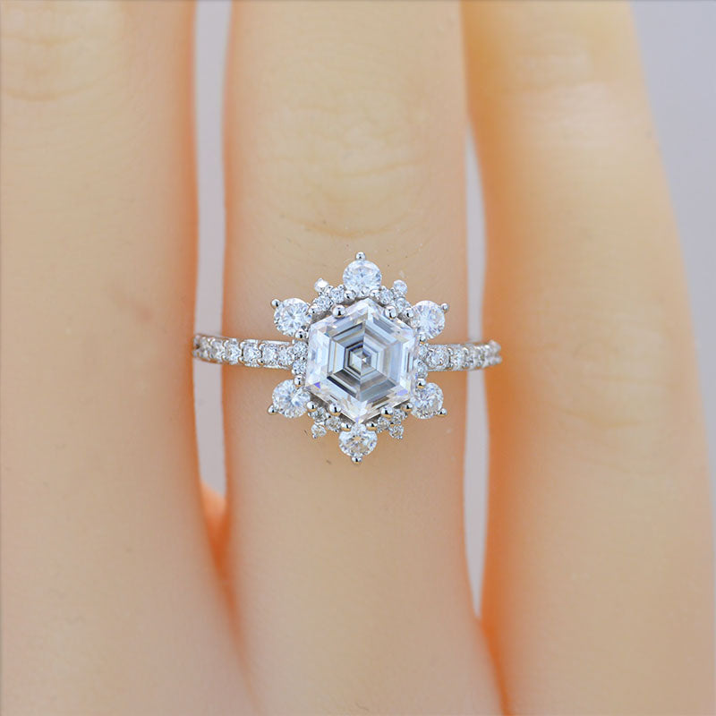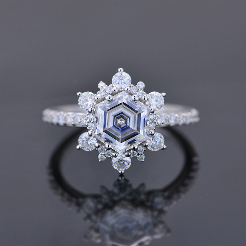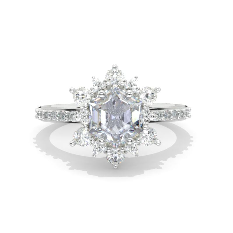 The default design option features 8mm Hexagon Cut Moissanite Stone, D-Colorless, VVS1-Clarity, VG-Cut, Ex-Polish, VG-Symmetry with 0.6 C.T.W. Accent StonesÂ
