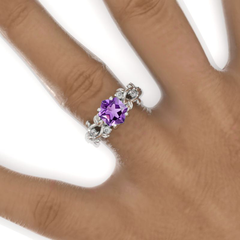 3 Carat Hexagon Natural Amethyst Floral 14K White Gold Engagement Ring - Giliarto