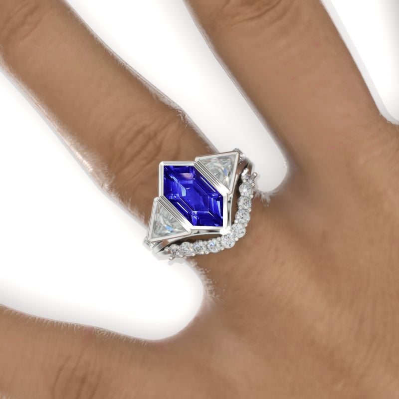 3 Carat Hexagon Natural Genuine Tanzanite Halo 14K White Gold Engagement Ring, Eternity Ring Set