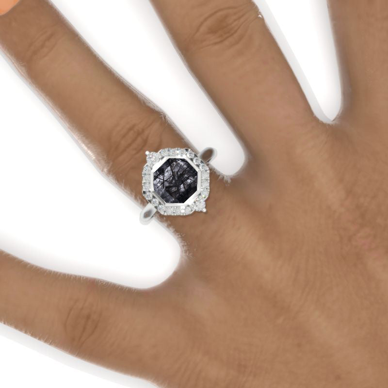 3 Carat Hexagon Natural Rutilated Quartz Halo 14K White Gold Engagemen - Giliarto