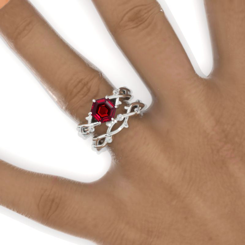 Engagement Ring: 3 Carat Ethically Lab-Grown Ruby AAA+ Grade Hexagon 8mm VG-Cut, Ex-Polish, VG-Symmetry Center Stone set with D- Colorless Moissanite Accent Stones in 14K White Gold Ring.