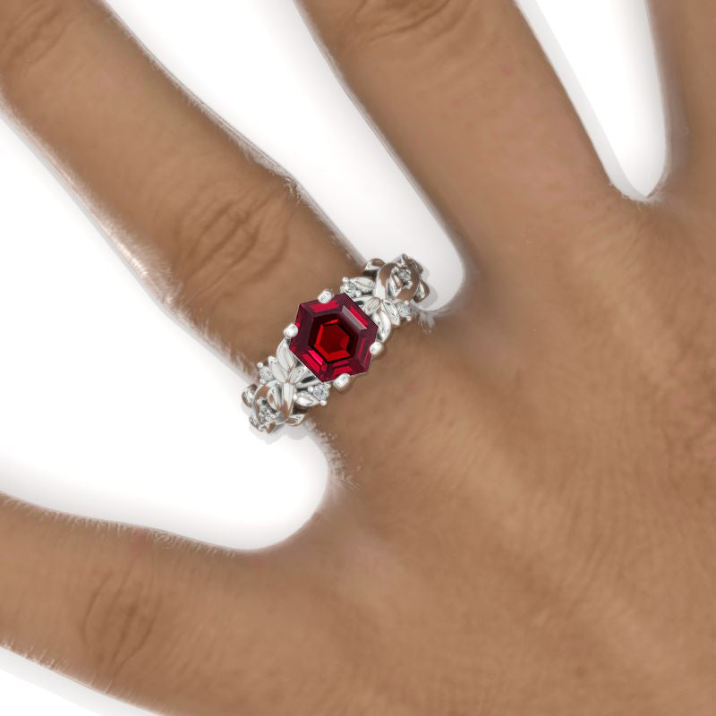 3 Carat Hexagon Ruby Floral 14K White Gold Engagement Ring - Giliarto