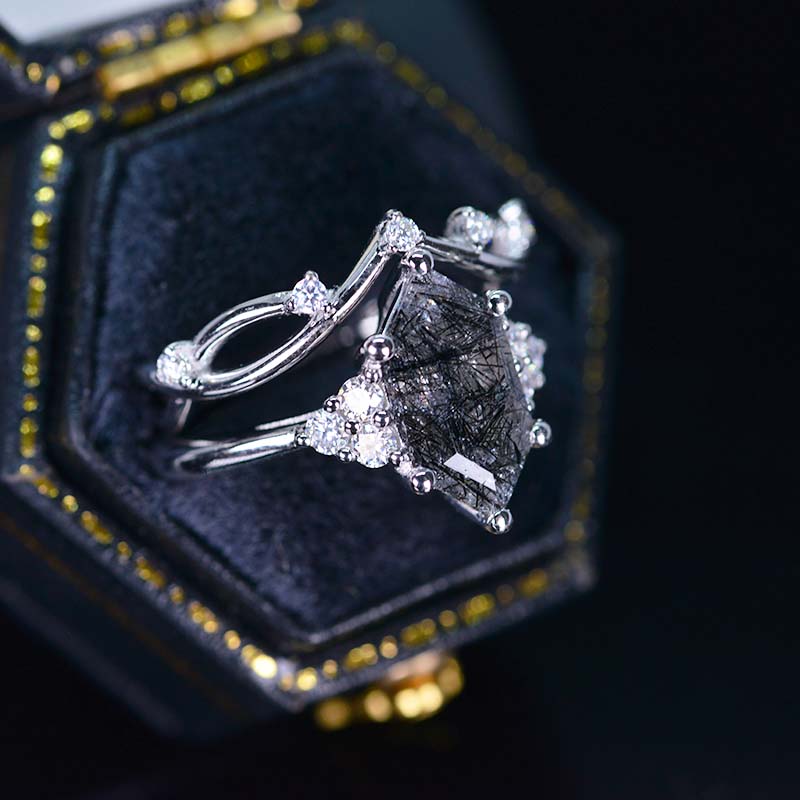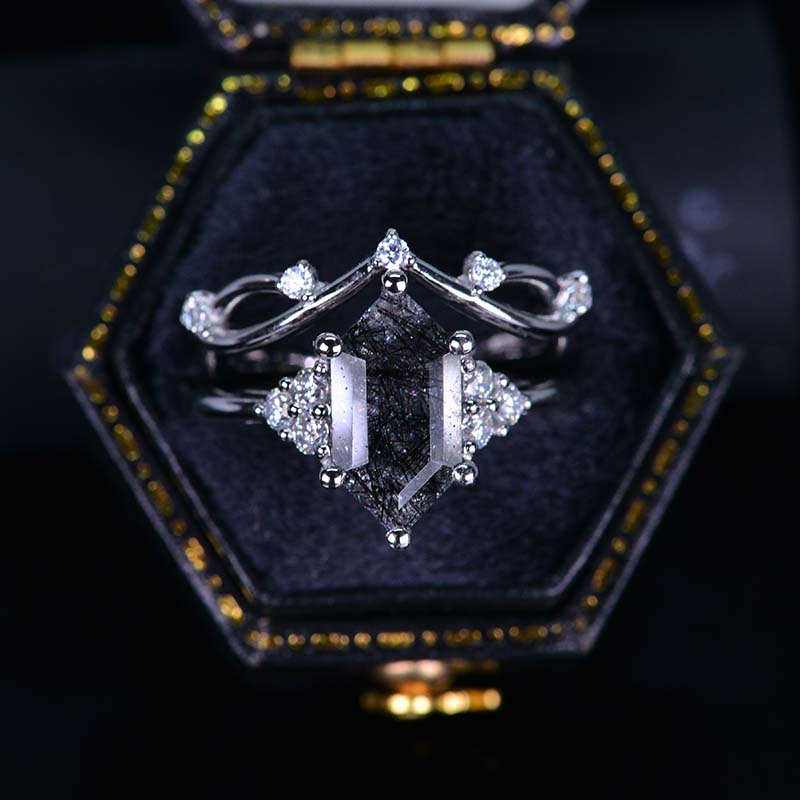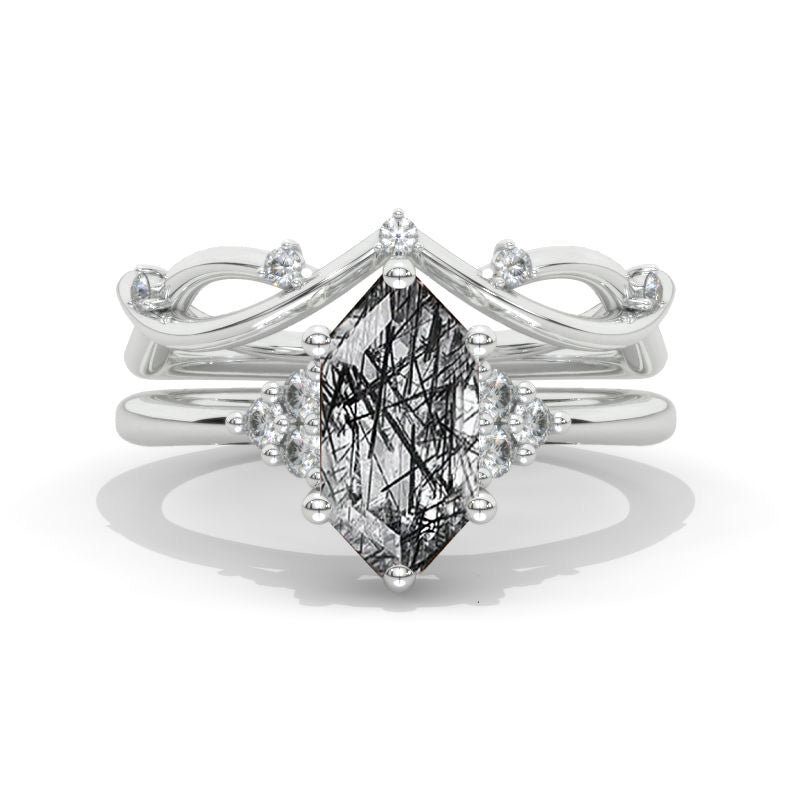 3 Carat Hexagon Rutilated Quartz Halo 14K White Gold Engagement Ring, Eternity Ring Set