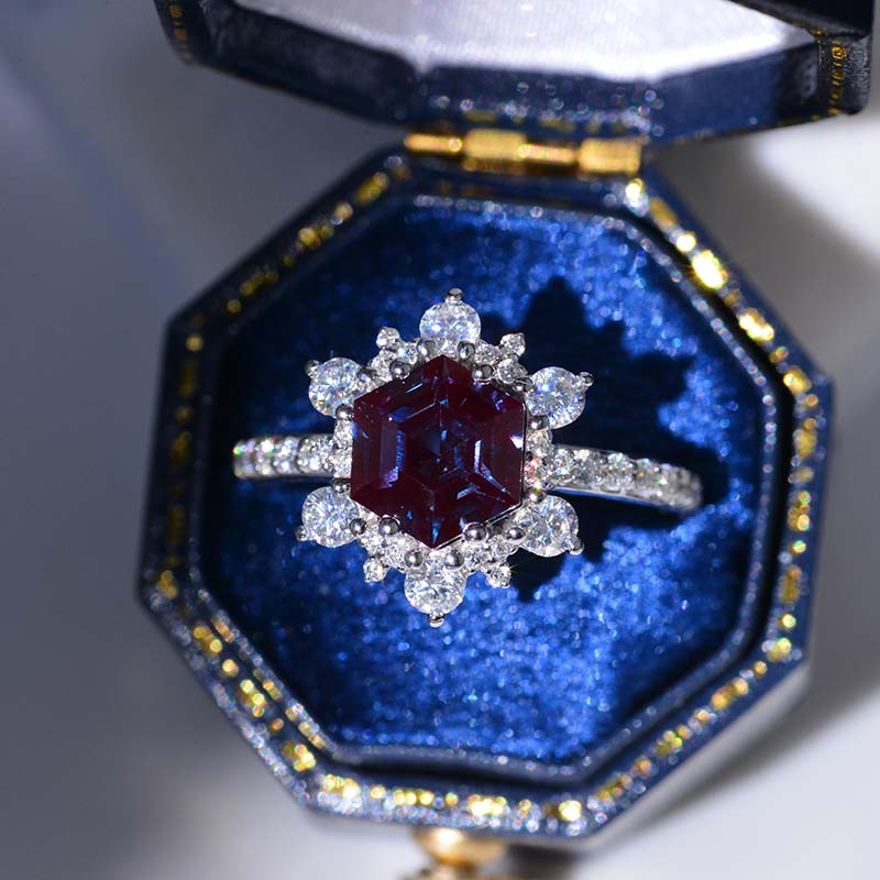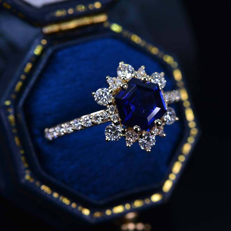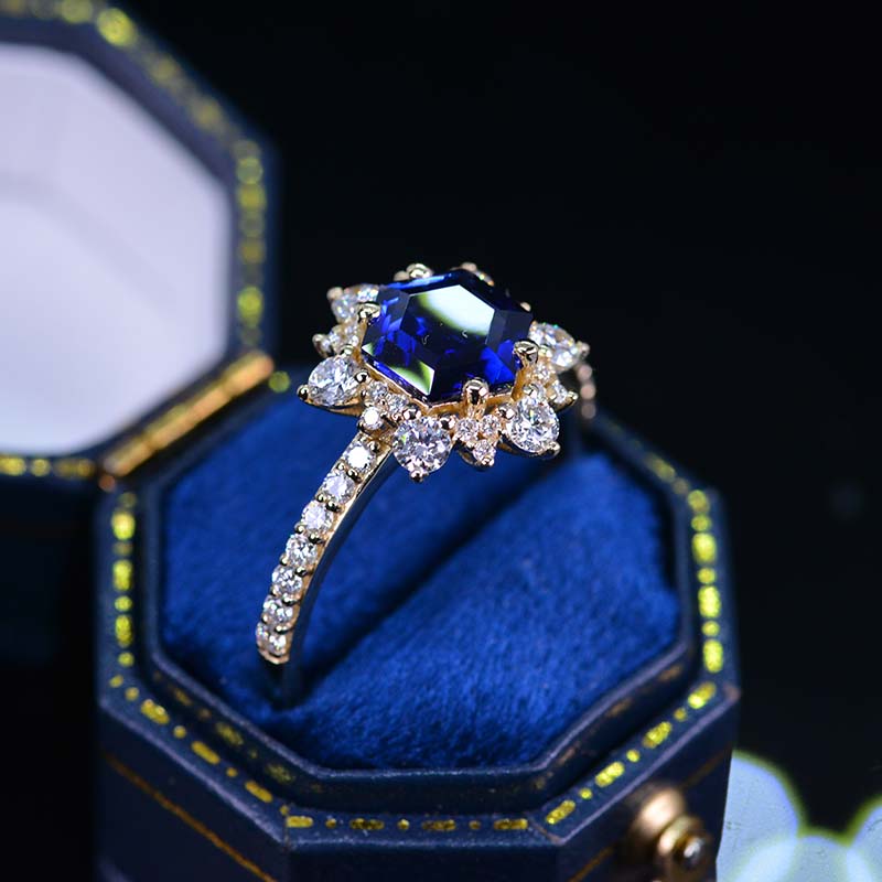 The default design option features 8mm Hexagon Cut Ethically LAB-Grown Royal Blue Sapphire Stone, VVS1-Clarity, VG-Cut, Ex-Polish, VG-Symmetry with 0.6 C.T.W. Moissanite Accent Stones