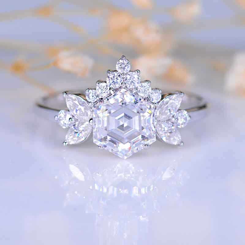 Engagement: 3 Carat Giliarto Moissanite Hexagon 8x7mm D-Colorless, VVS1-Clarity, VG-Cut, Ex-Polish, VG-Symmetry Center Stone with Colorless 0.5 CTW Moissanite Accent Stones 14K White Gold Ring.