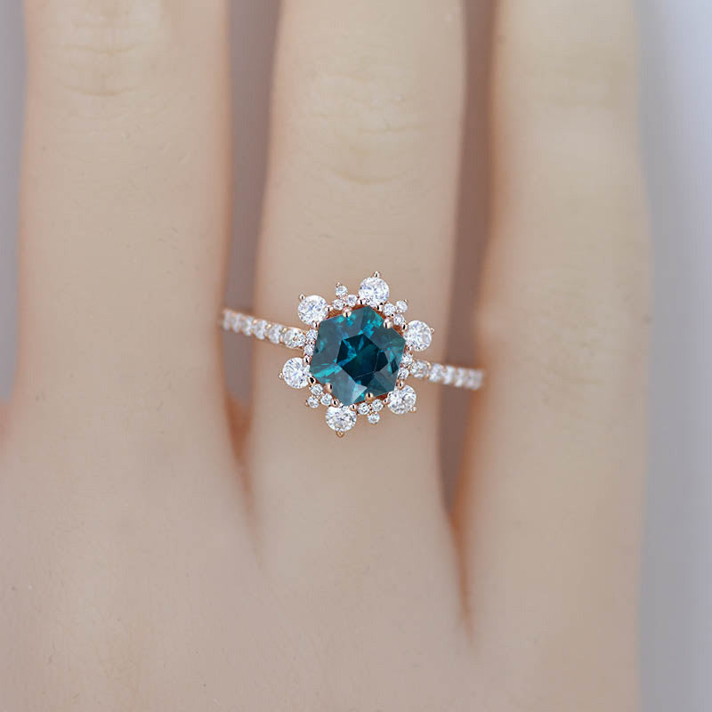 3 Carat Hexagon Teal Sapphire Snowflake Halo Engagement Ring. Victoria - Giliarto