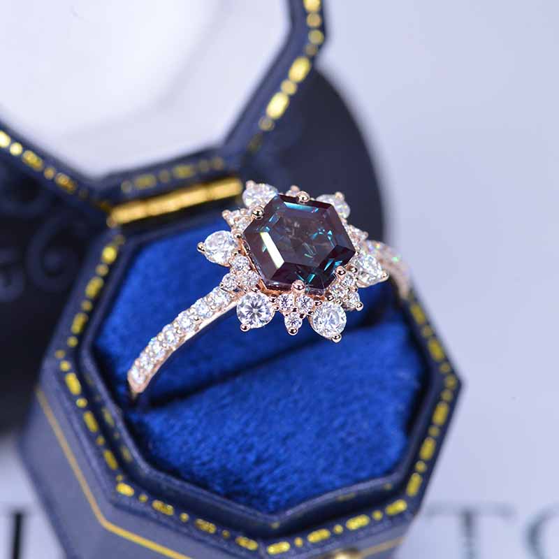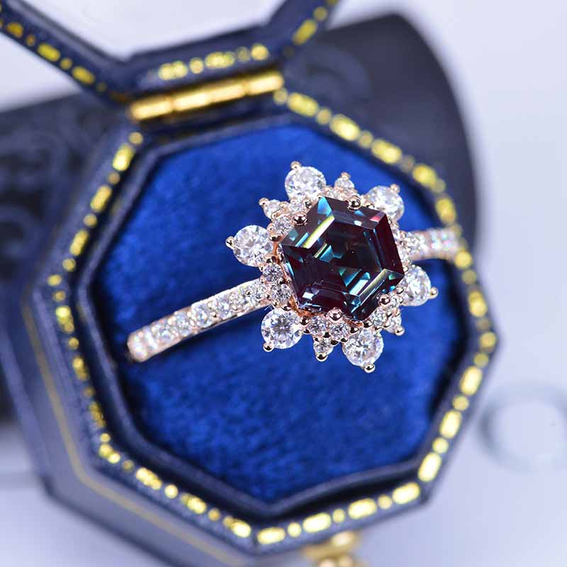 The default design option features 8mm Hexagonal Ethically Lab-Grown  Alexandrite, VVS1-Clarity, VG-Cut, Ex-Polish, VG-Symmetry with D - Colorless Moissanite Accents