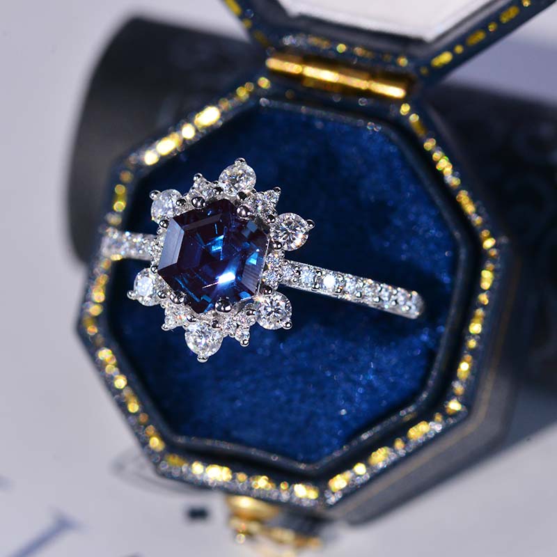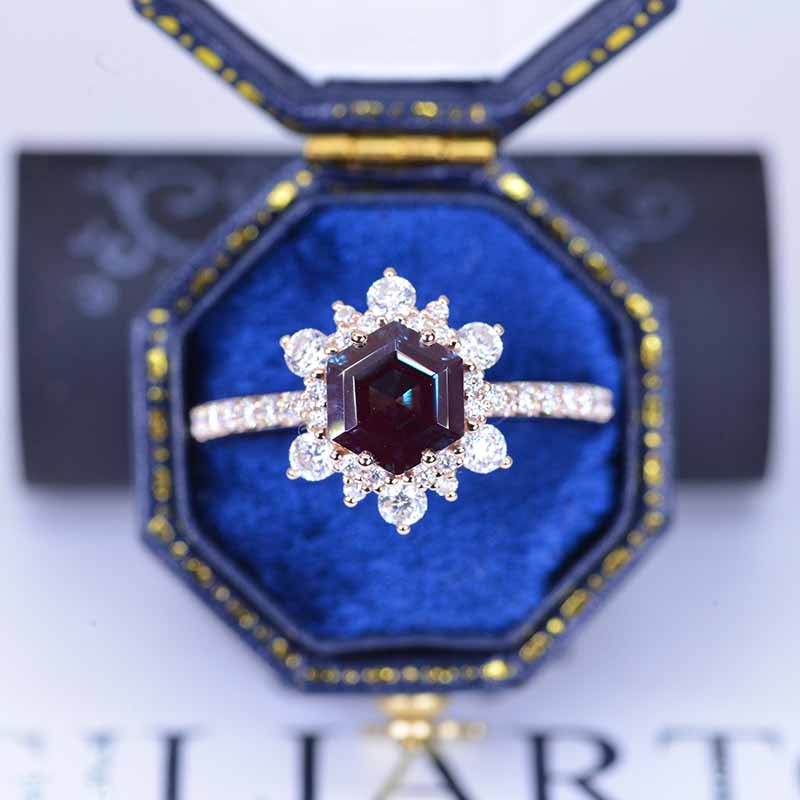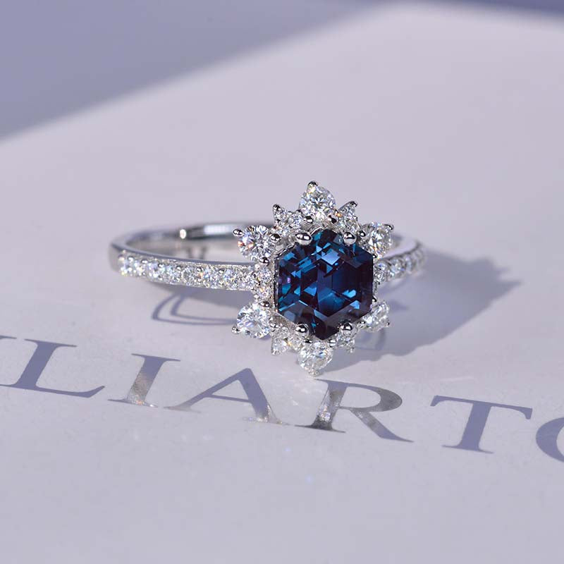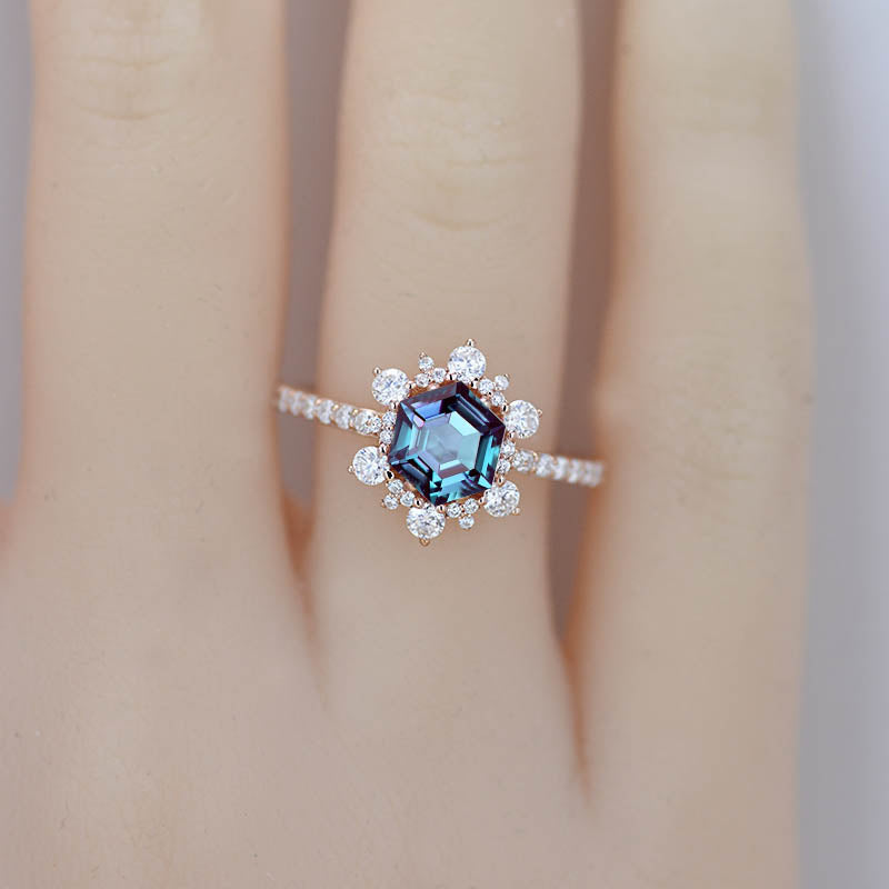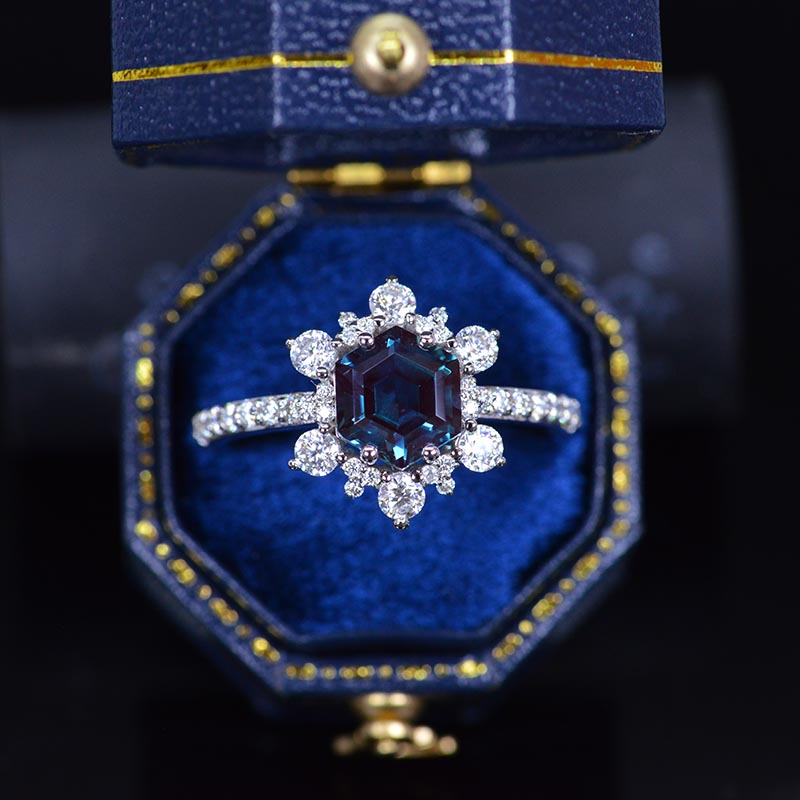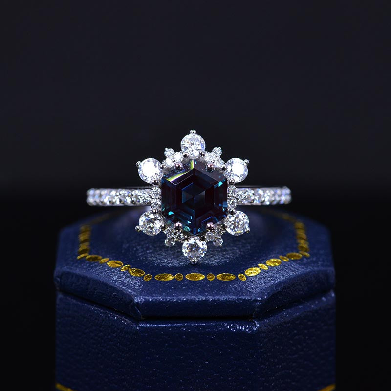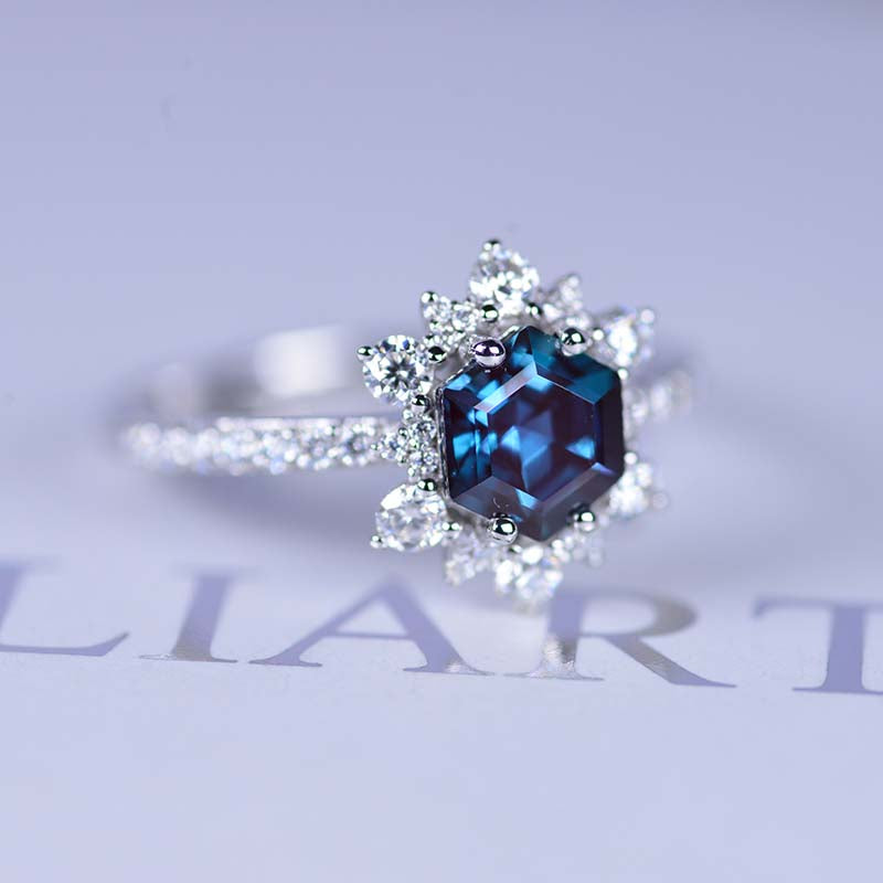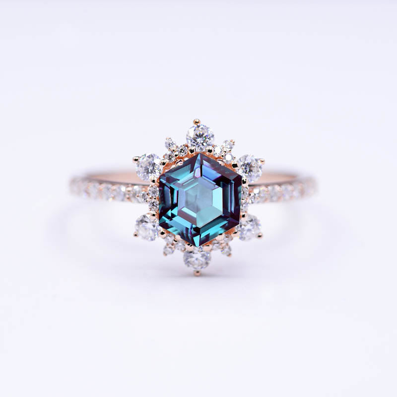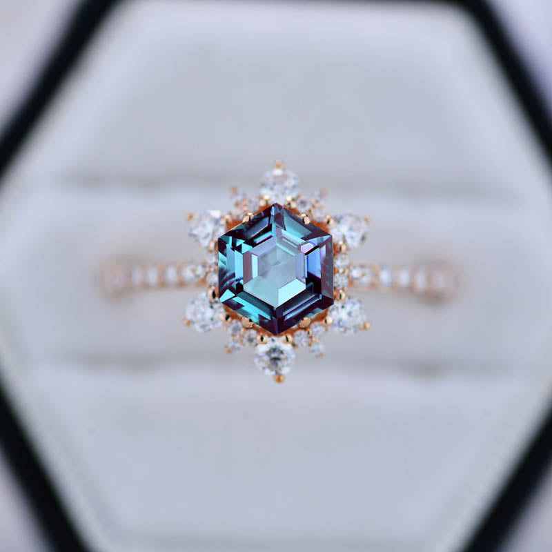 3 Carat Hexagonal Alexandrite Snowflake Halo Engagement Ring. Victoria - Giliarto