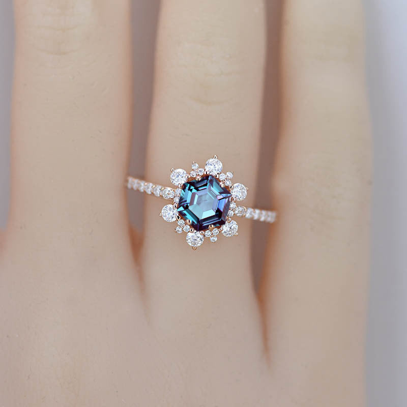 3 Carat Hexagonal Alexandrite Snowflake Halo Engagement Ring. Victoria - Giliarto