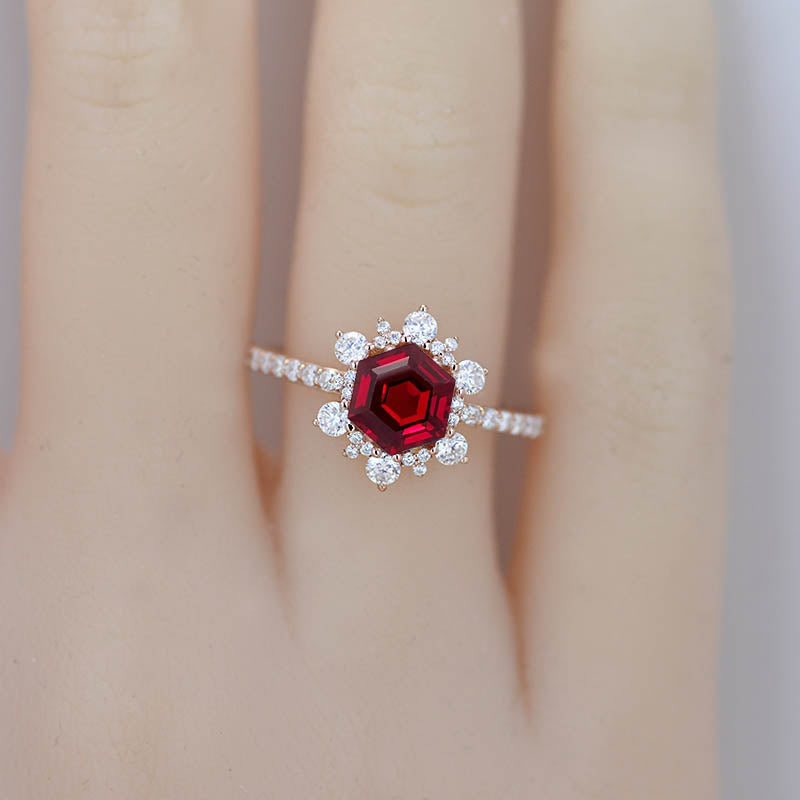3 Carat Hexagonal Ruby Snowflake Halo Engagement Ring. Victorian 14K Rose Gold Ring