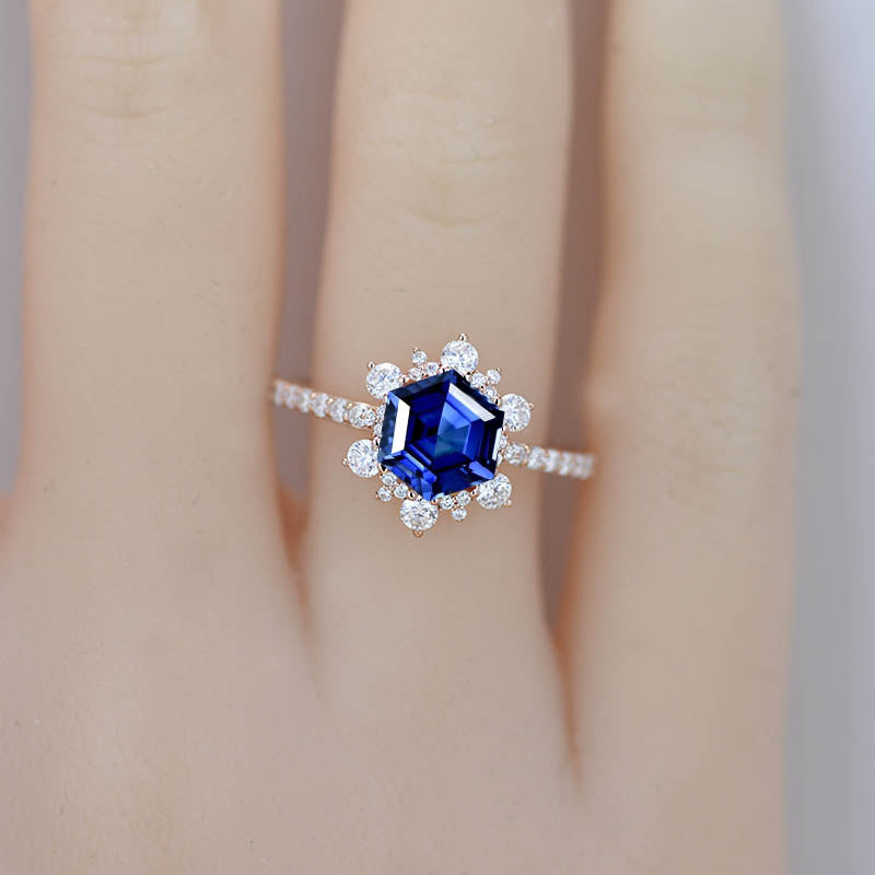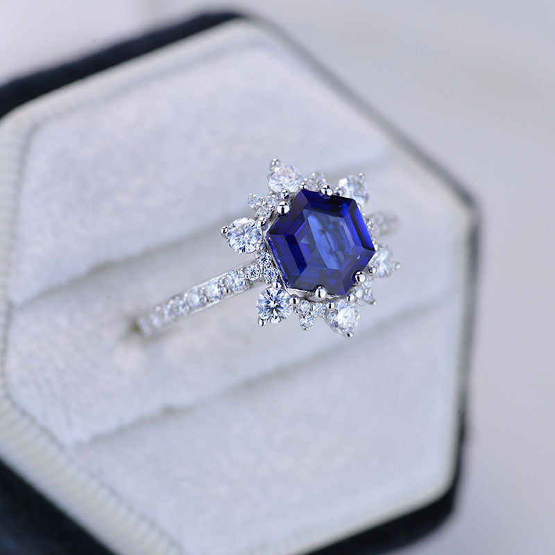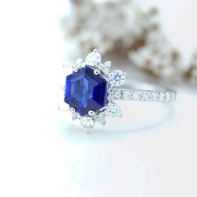 The default design option features 8mm Hexagonal Ethically Lab-Grown  Sapphire, VVS1-Clarity, VG-Cut, Ex-Polish, VG-Symmetry with D-Colorless Moissanite Accents