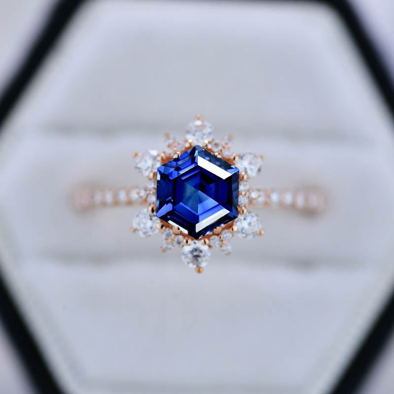 3 Carat Hexagonal Sapphire Snowflake Halo Engagement Ring. Victorian 14K Rose Gold Ring