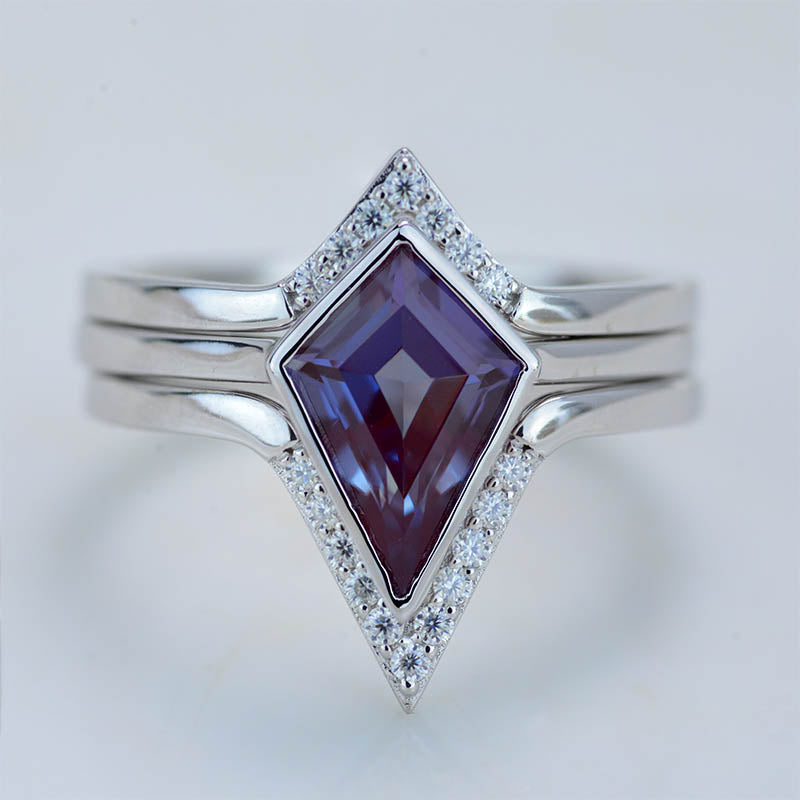 Engagement : 3 Carat Ethically Lab-Grown Alexandrite  Kite 12x8mm, VG-Cut, Ex-Polish, VG-Symmetry Center Stone set in PT900 Platinum Ring.