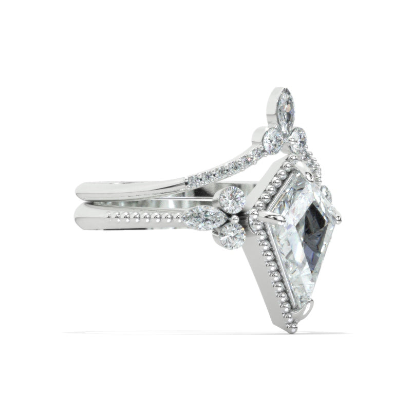 Engagement Ring:  Approximately 3+ Carat LAB-Grown Diamond Kite 12x8mm D-Colorless, VVS1-Clarity, VG-Cut, Ex-Polish, VG-Symmetry Center Stone and LAB-Grown Diamond D-Colorless, VVS1-Clarity, Accents Stones in 14K White Gold Ring.
