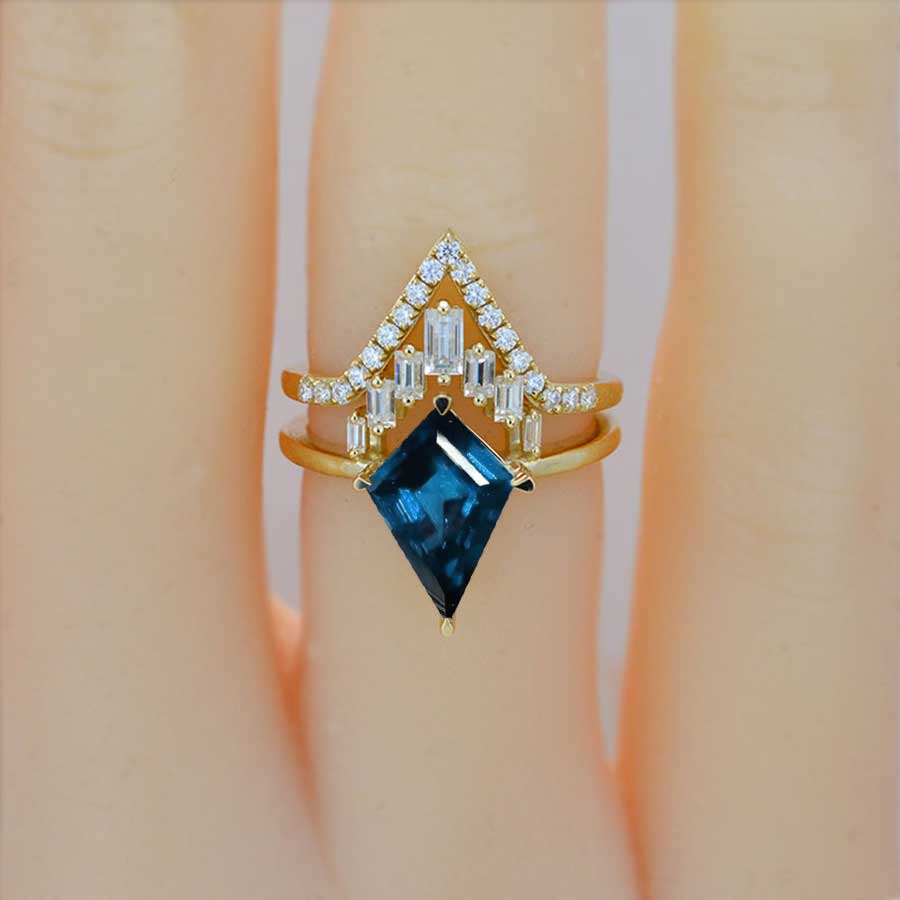 3 Carat Kite Cornflower Sapphire Halo 14K Gold Engagement Ring, Eternity Ring Set