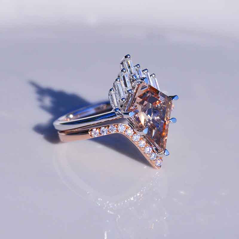 Engagement : 3 Carat Genuine Peach Morganite Kite 12x8 mm  VG-Cut, Ex-Polish, VG-Symmetry Center Stone with 38 Colorless 0.5 CTW Moissanite