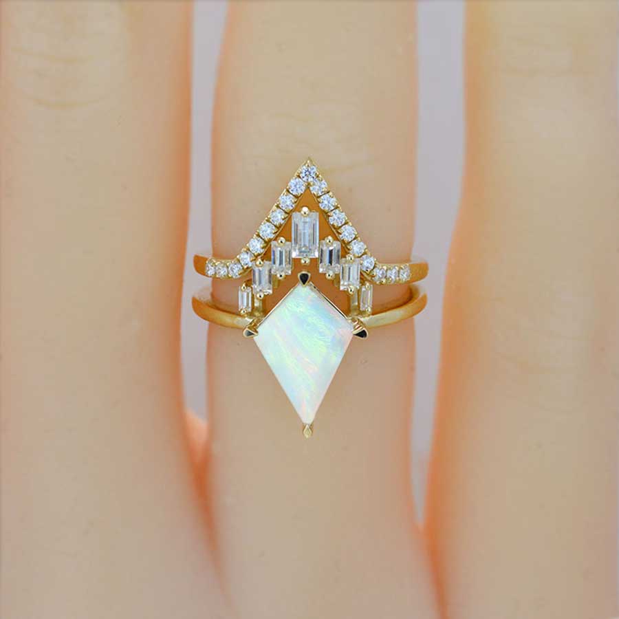 3 Carat Kite Genuine White Opal Halo 14K Gold Engagement Ring, Eternity Ring Set