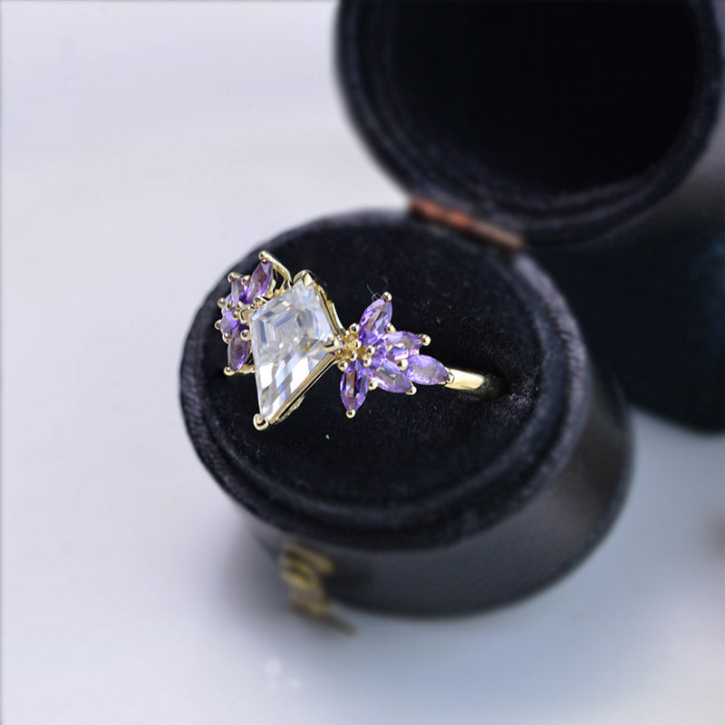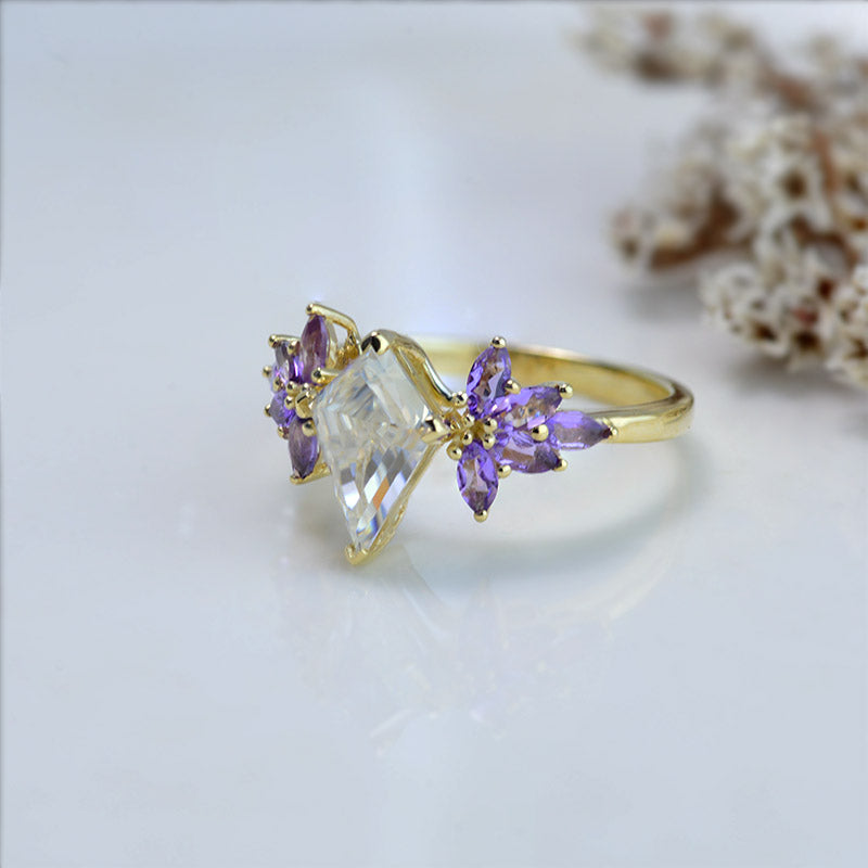 The default design option features 12x8mm Kite Center Moissanite Stones,  D-Colorless, VVS1-Clarity, VG-Cut, Ex-Polish, VG-Symmetry, Set with Colorless Amethyst Accent stones in 14K Yellow Gold Engagement Ring.Â