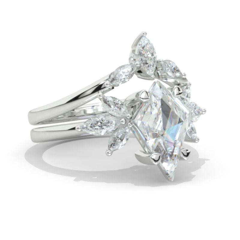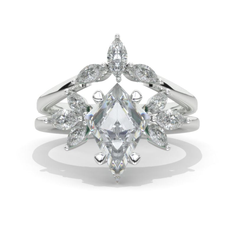 The default design option features 12x8mm Kite Center Moissanite Stones,Â