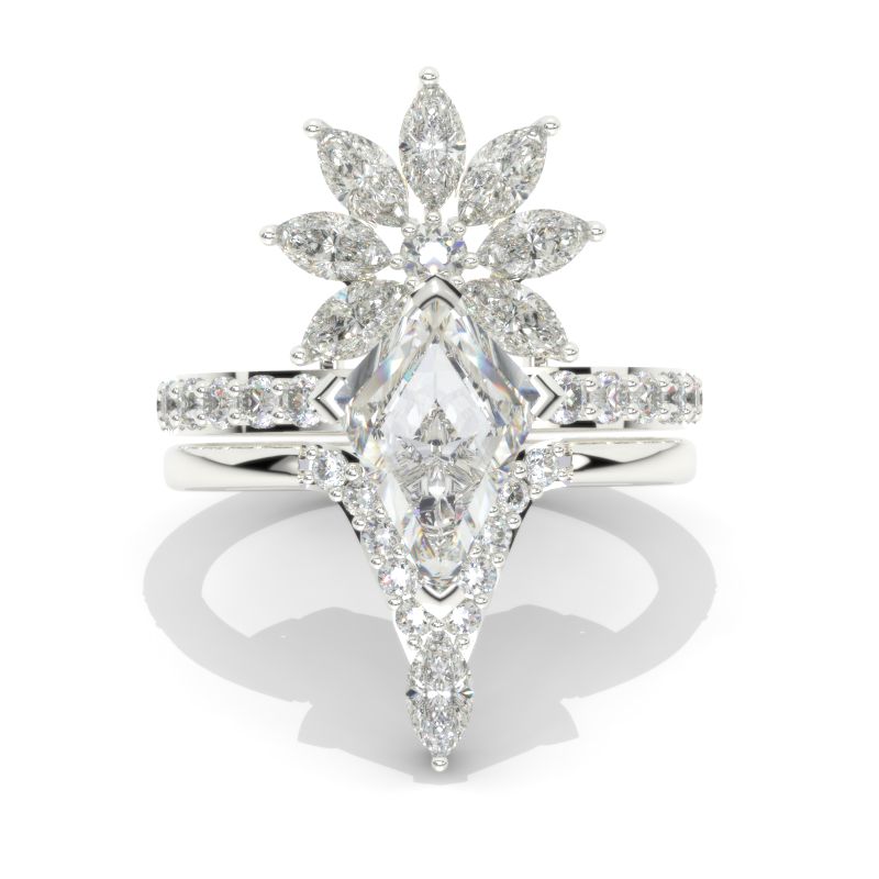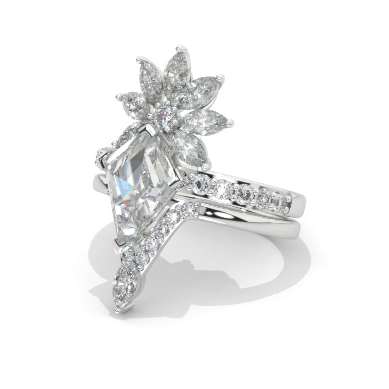 The default design option features 12x8mm Kite Center Moissanite Stones,Â