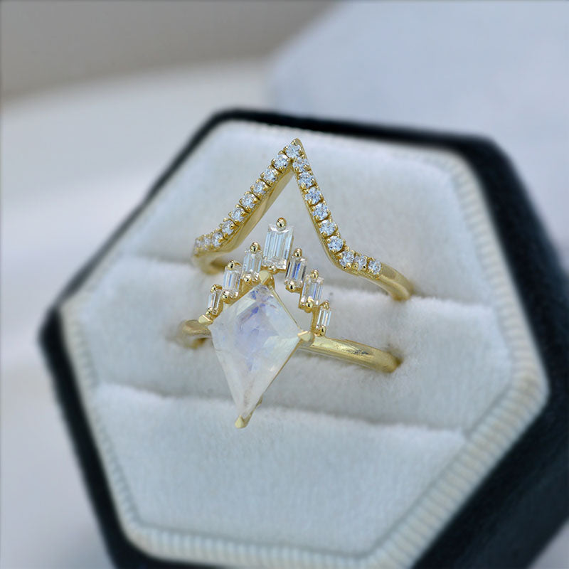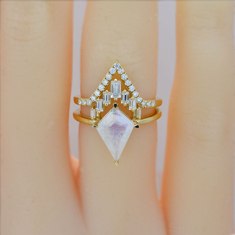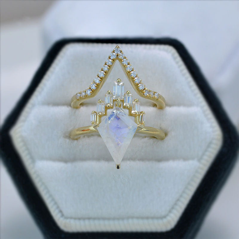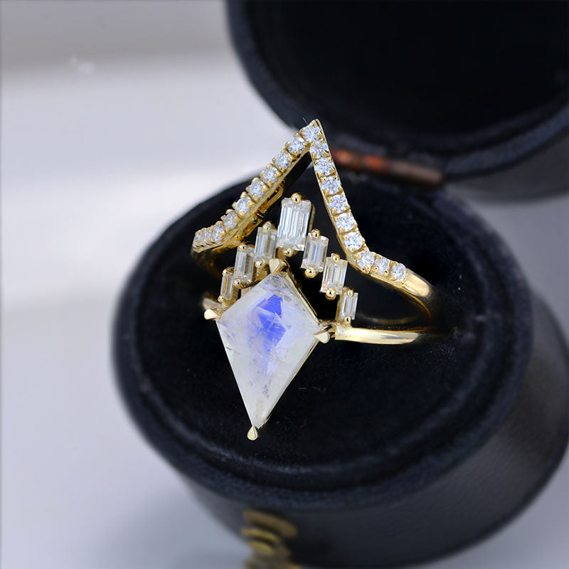 3 Carat Kite Moonstone Halo 14K Gold Engagement Ring, Eternity Ring Set