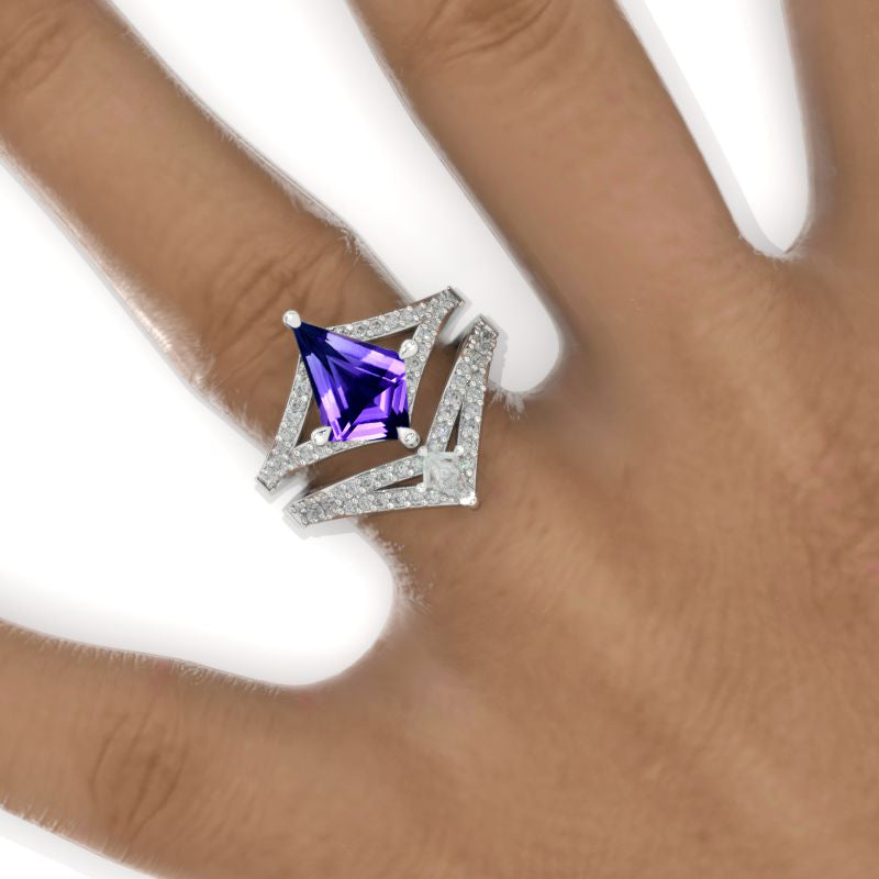 3 Carat Kite Natural Amethyst Halo 14K White Gold Engagement Ring, V Eternity Ring Set