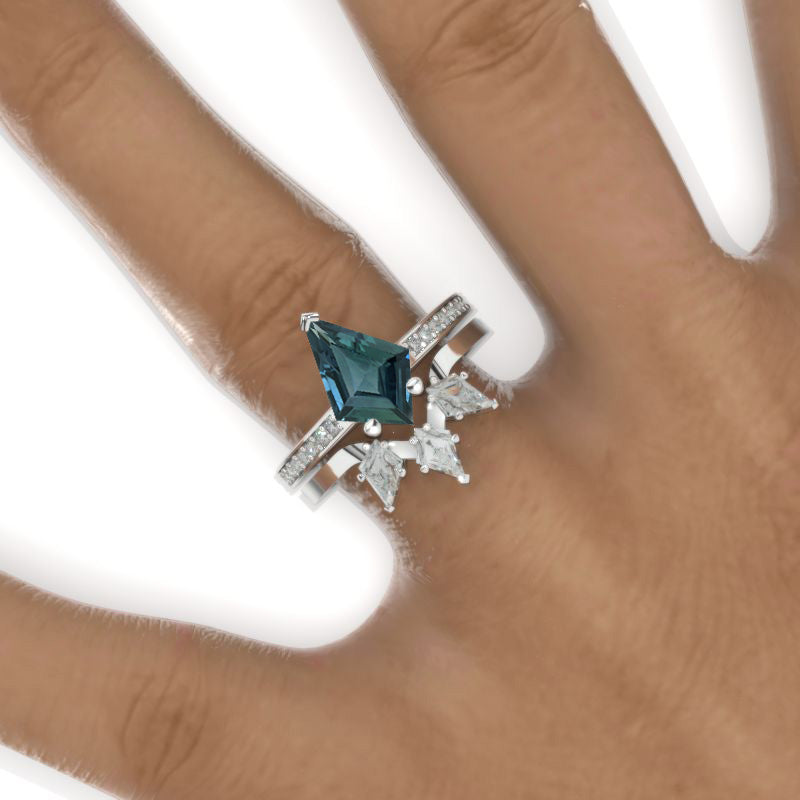 3 Carat Kite Teal Sapphire Engagement Ring. 3CT Fancy Shape Teal Sapphire Ring Set
