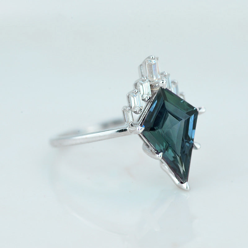 Engagement : 3 Carat Ethically Lab-Grown Teal Sapphire Kite 10x6 mm VG-Cut, Ex-Polish, VG-Symmetry Center Stone with 38 Colorless 0.5 CTW Moissanite