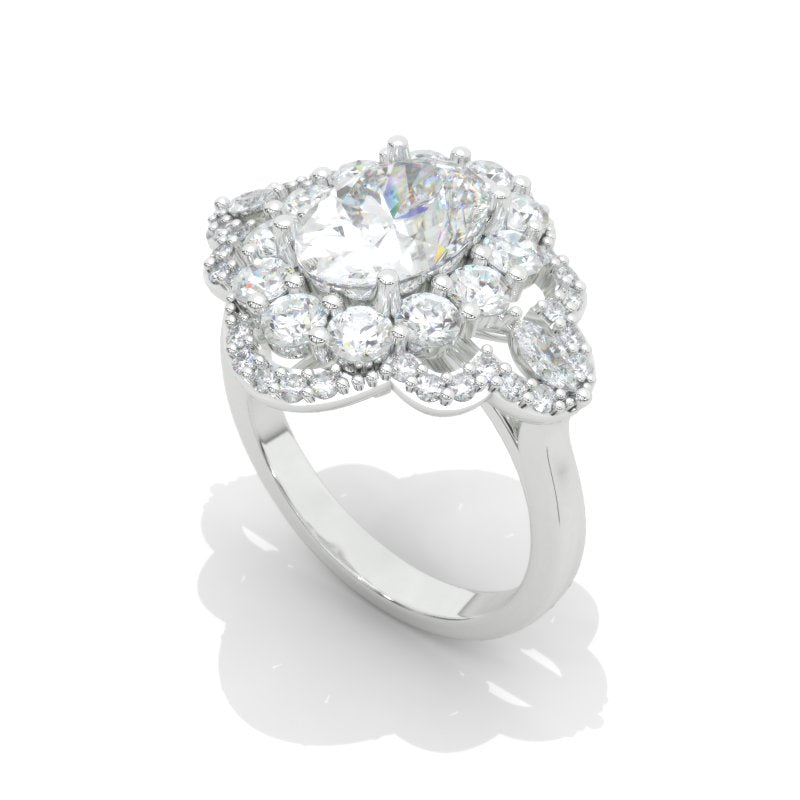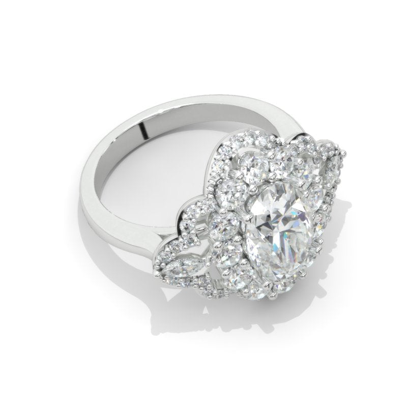 The default design option features 10x7mm Oval LAB-Grown Diamond Center StoneĀ D-Colorless, VVS1-Clarity, VG-Cut, Ex-Polish, VG-Symmetry
