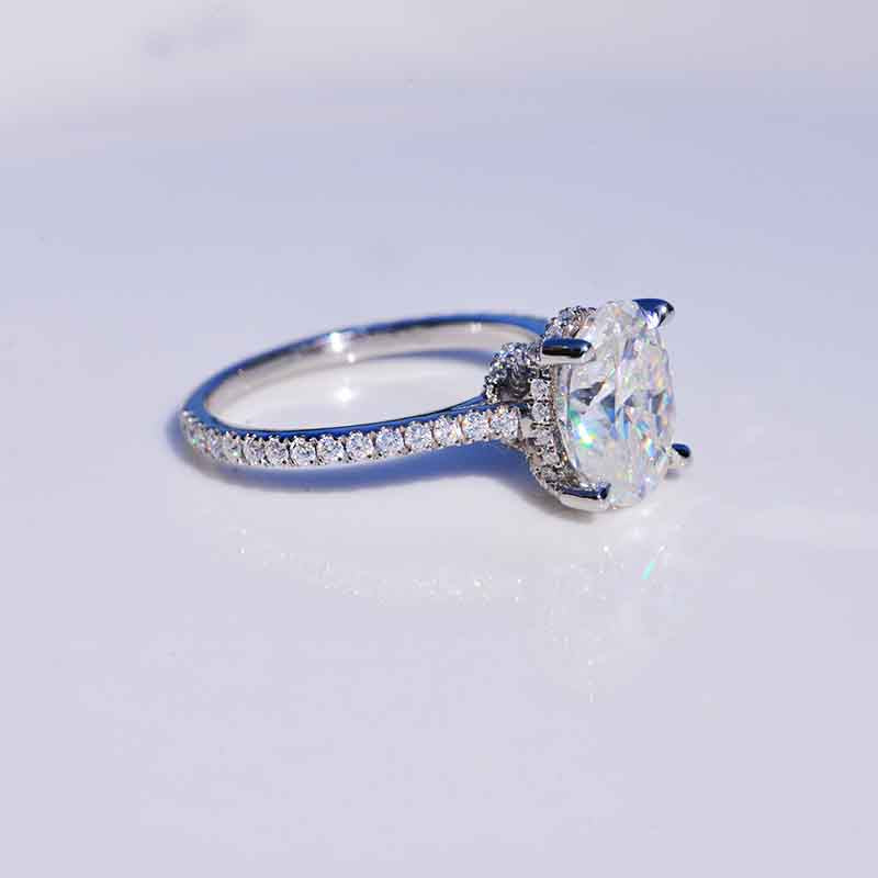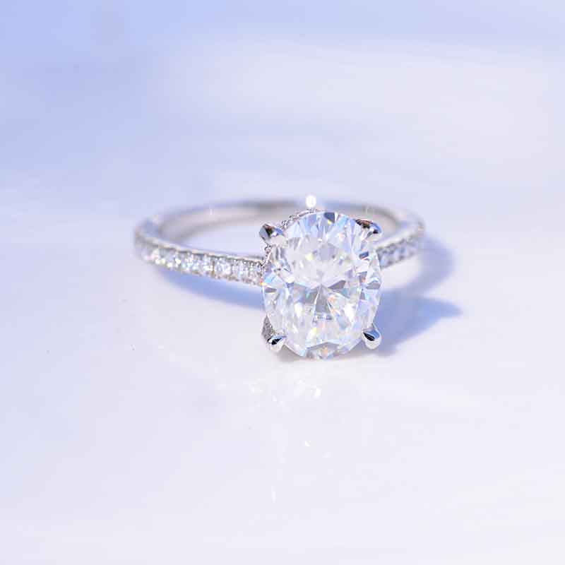 The default design option features approximately 3+ Carat Oval Cut 10x8mm Lab-Grown Diamond Center Stone D-Colorless, VVS1-Clarity, VG-Cut, Ex-Polish, VG-Symmetry with 0.5 CTW Accents