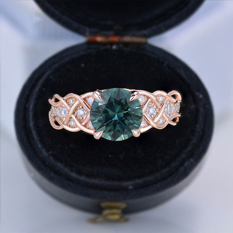 The default design option features 3 Carat Round 9mm Ethically Lab-Grown Teal Sapphire Engagement Ring with 24 - 0.2 CTW Moissanite Accent Stones 14K Rose Gold Ring.