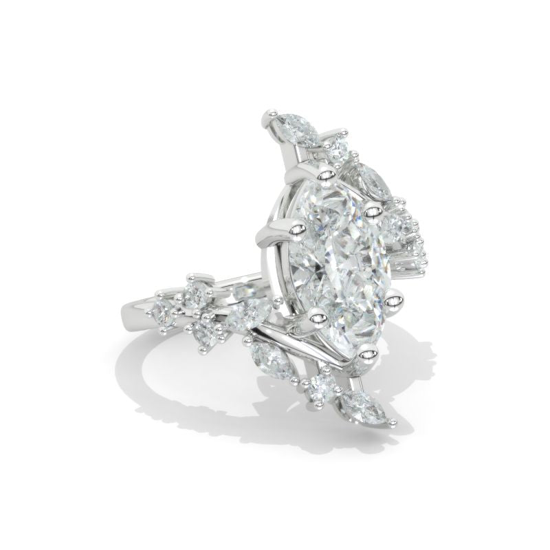 The default design option features 14x7.5mm Marquise Cut LAB-Grown Diamond Center Stone D-Colorless VVS1-Clarity, VG-Cut, Ex-Polish, VG-Symmetry with Approximately 1.4+ CTW LAB-Grown Diamond Accent Stones