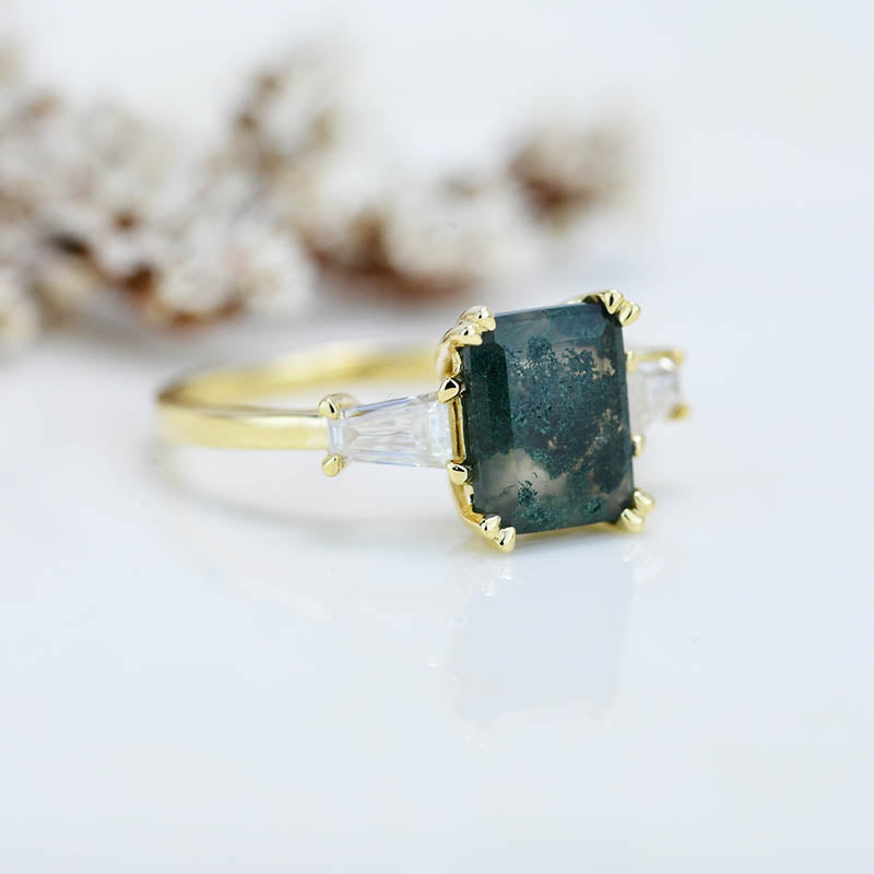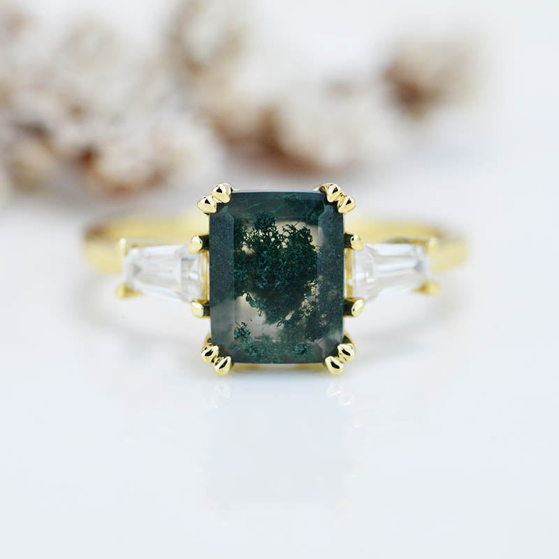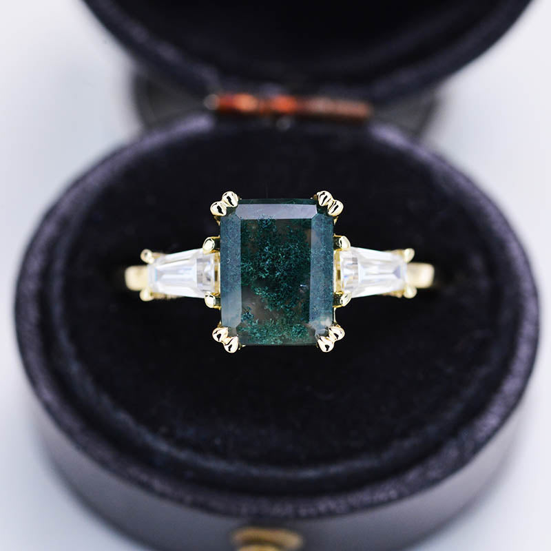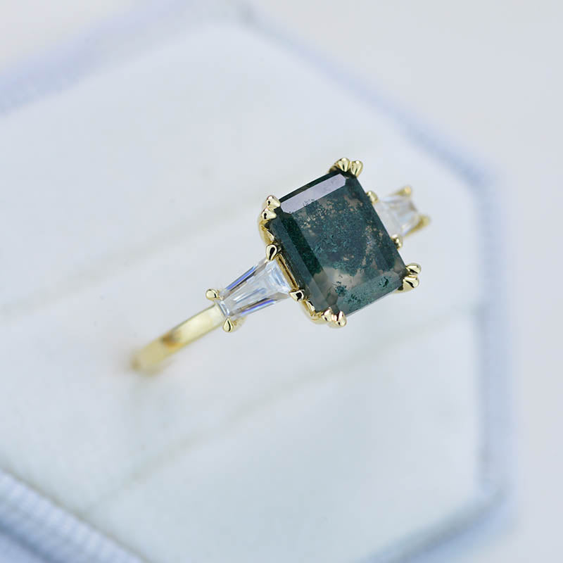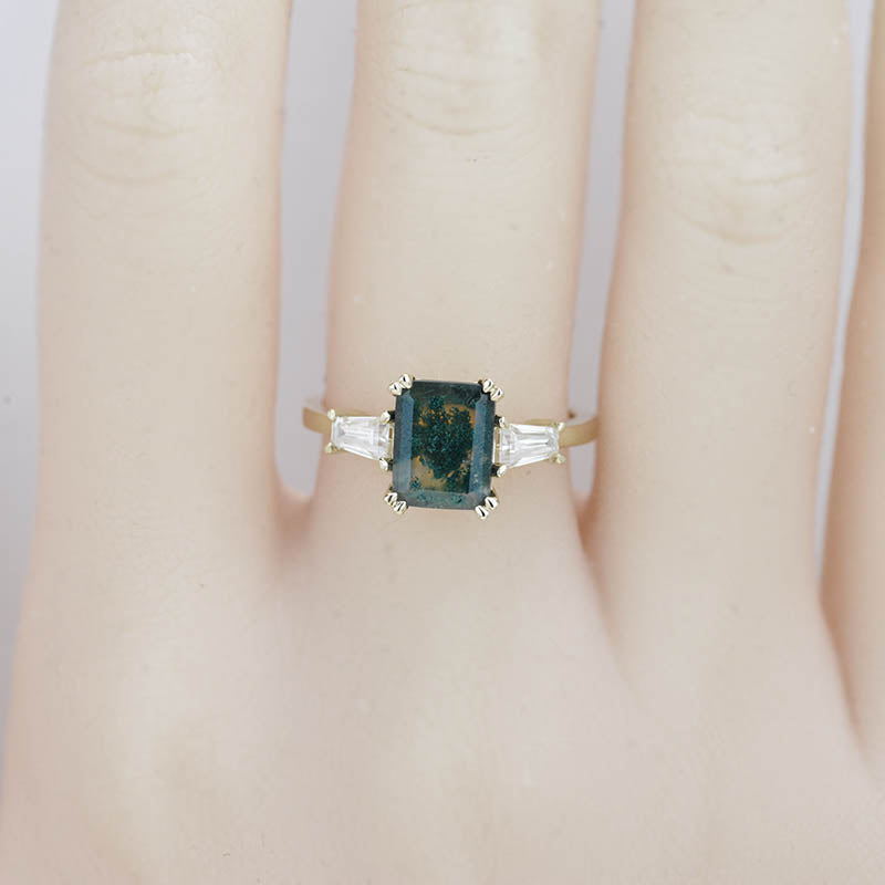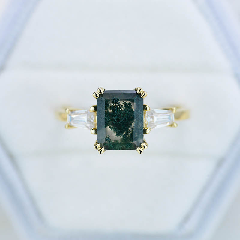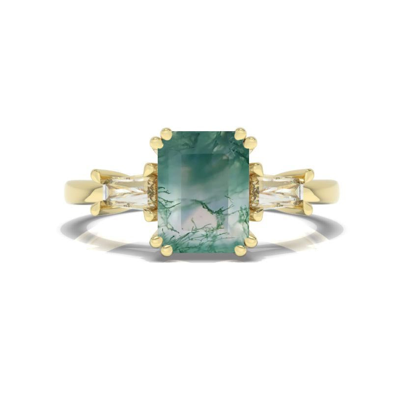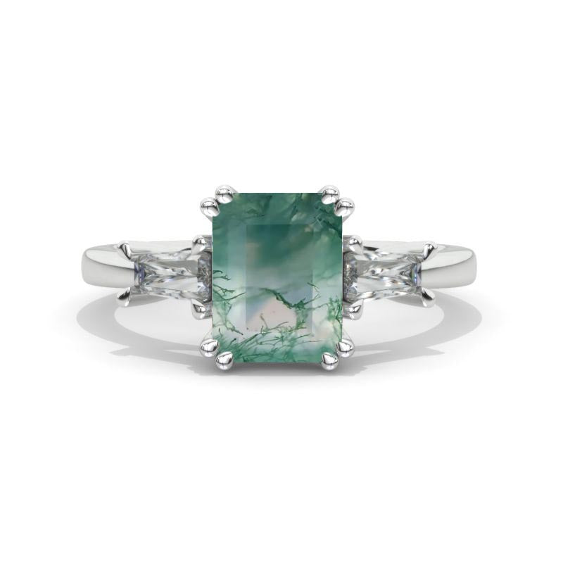 The default design option features approximately 3 Carat Moss Agate Emerald Cut 9x7mm VG-Cut, Ex-Polish, VG-Symmetry Center Stone Set With Lab-Grown Diamonds Side Stones