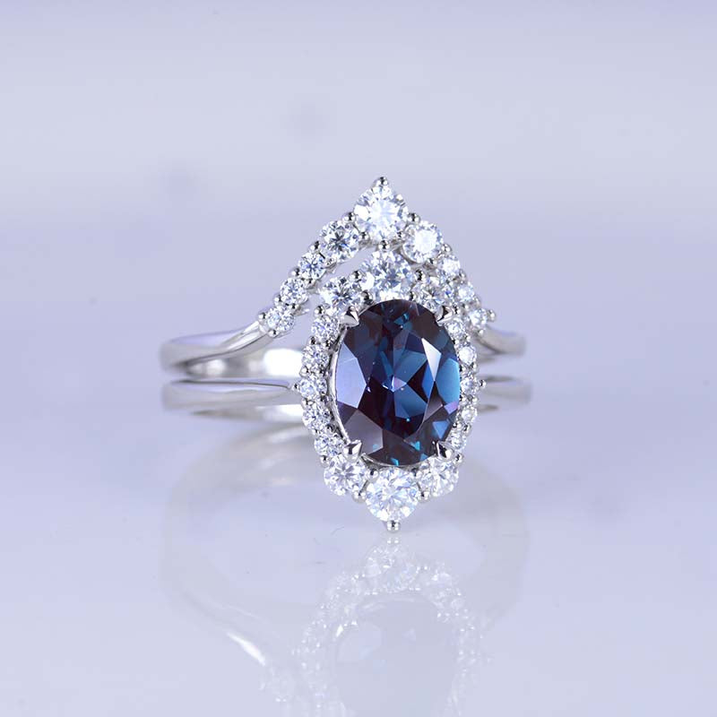 The default design option features 10x8mm Oval Ethically Lab-Grown Alexandrite Stone, VVS1-Clarity, VG-Cut, Ex-Polish, VG-Symmetry Set with D- Colorless Moissanite Accents Stones in 14K White Gold Engagement Ring.
