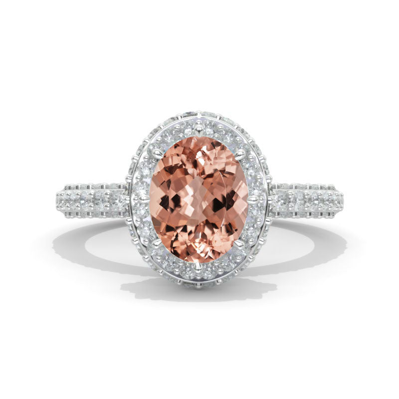 3 Carat Oval Cut Genuine Peach Morganite Double Halo White Gold Engagement Ring Model 40-9x7