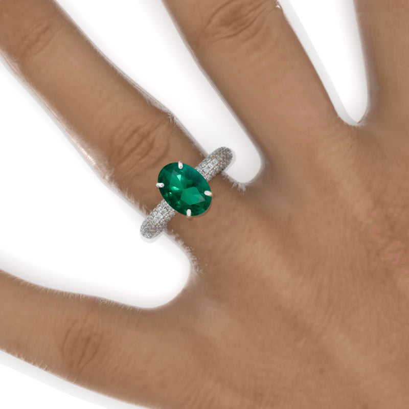 3 Carat Ethically Lab-Grown Emerald 10x7mm Oval Center Stone Ex-Cut, Ex-Polish, VG-Symmetry with 0.95 CTW Moissanite (D-Colorless, VVS1 clarity) French-Set Accent Stones 14K White  Gold  Ring.