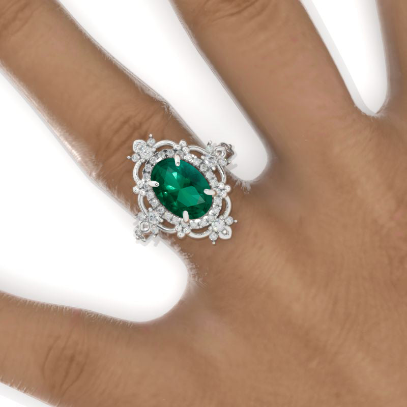 Engagement Ring Approximately 3 Carat Ethically Lab-Grown Emerald 8x6mm Oval D- Colorless, VVS1-Clarity, VG-Cut, Ex-Polish, VG-Symmetry Center Stone set with D- Colorless Moissanite Accent Stones in