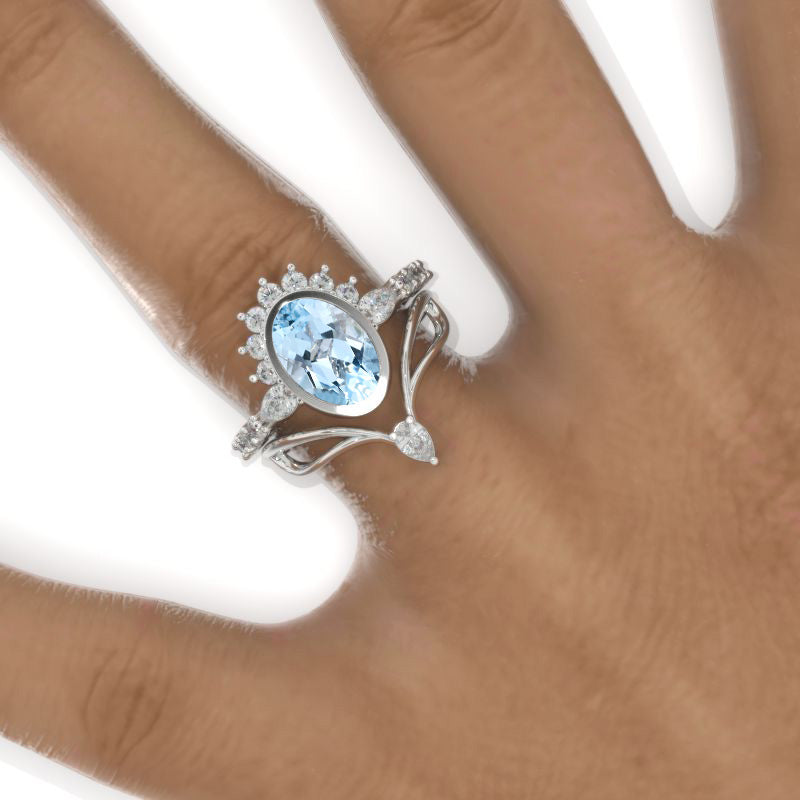 3 Carat Oval Genuine Aquamarine Bezel Set Engagement Ring Eternity Ring Set
