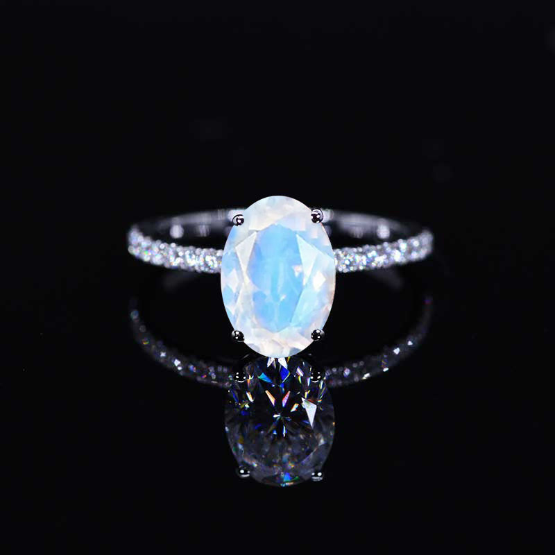The default design option features 10x7mm Oval Cut Genuine Moonstone and Accent Stones, D-Colorless, VVS1-Clarity, VG-Cut, Ex-Polish, VG-Symmetry, Set with Colorless Moissanite Accent stones in 14K White Gold Engagement Ring.