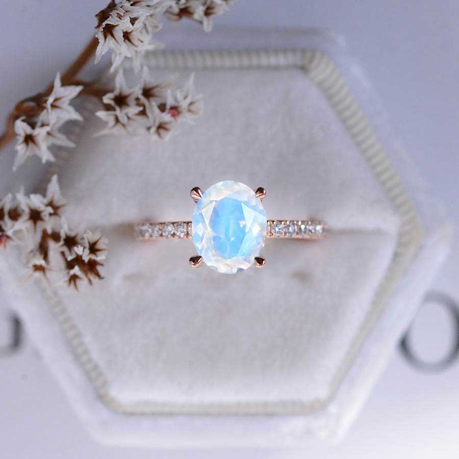 3 Carat Oval Genuine Moonstone Ring, Hidden Halo Gold Engagement Ring