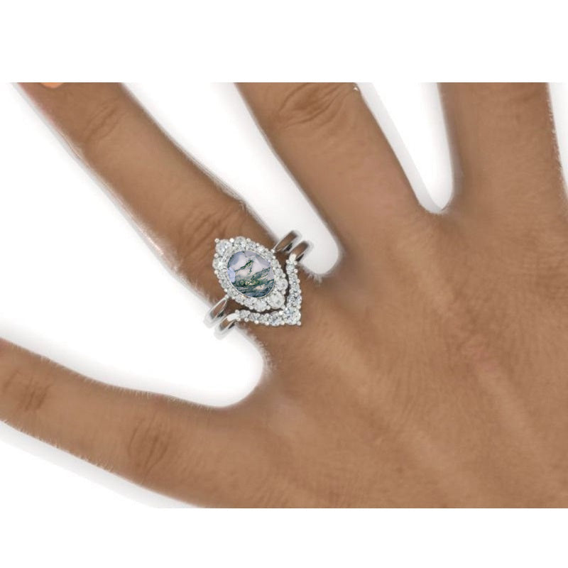 3 Carat Oval Genuine Moss Agate Halo Engagement Ring, Promise Ring For Her, Genuine Moss Agate Wedding Ring, 14K Gold Oval Moss Agate Engagement Ring Set Model 461-10x8 with 461E